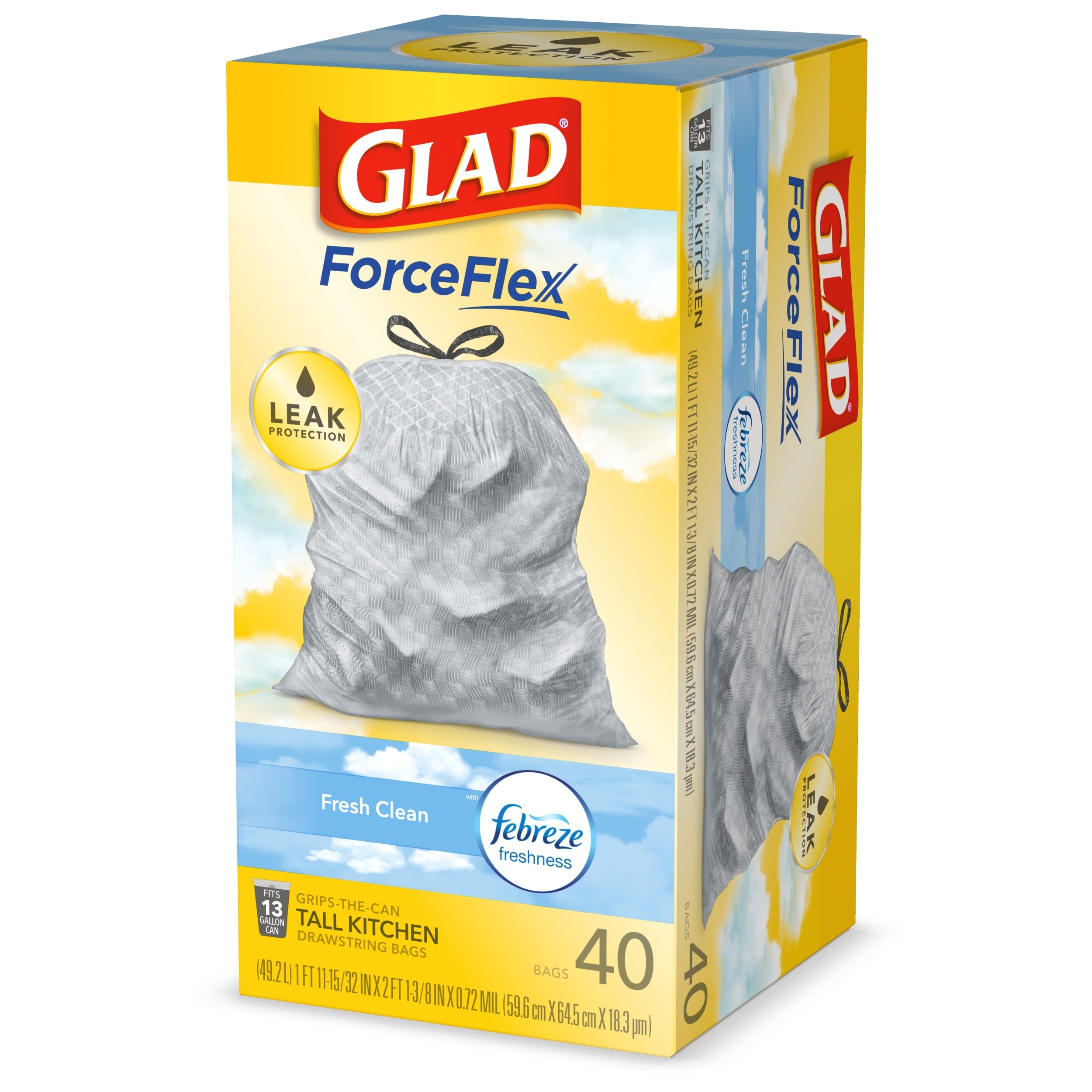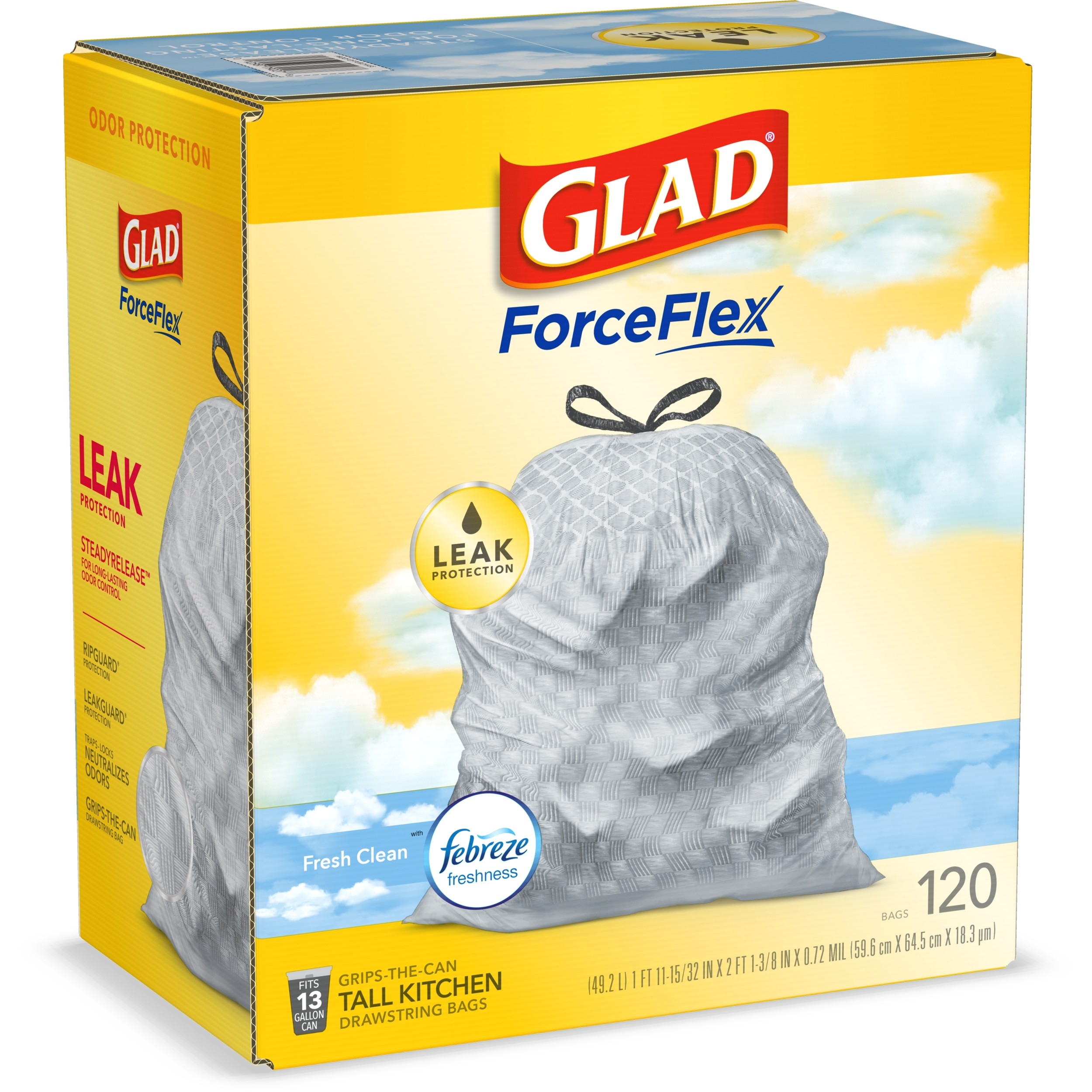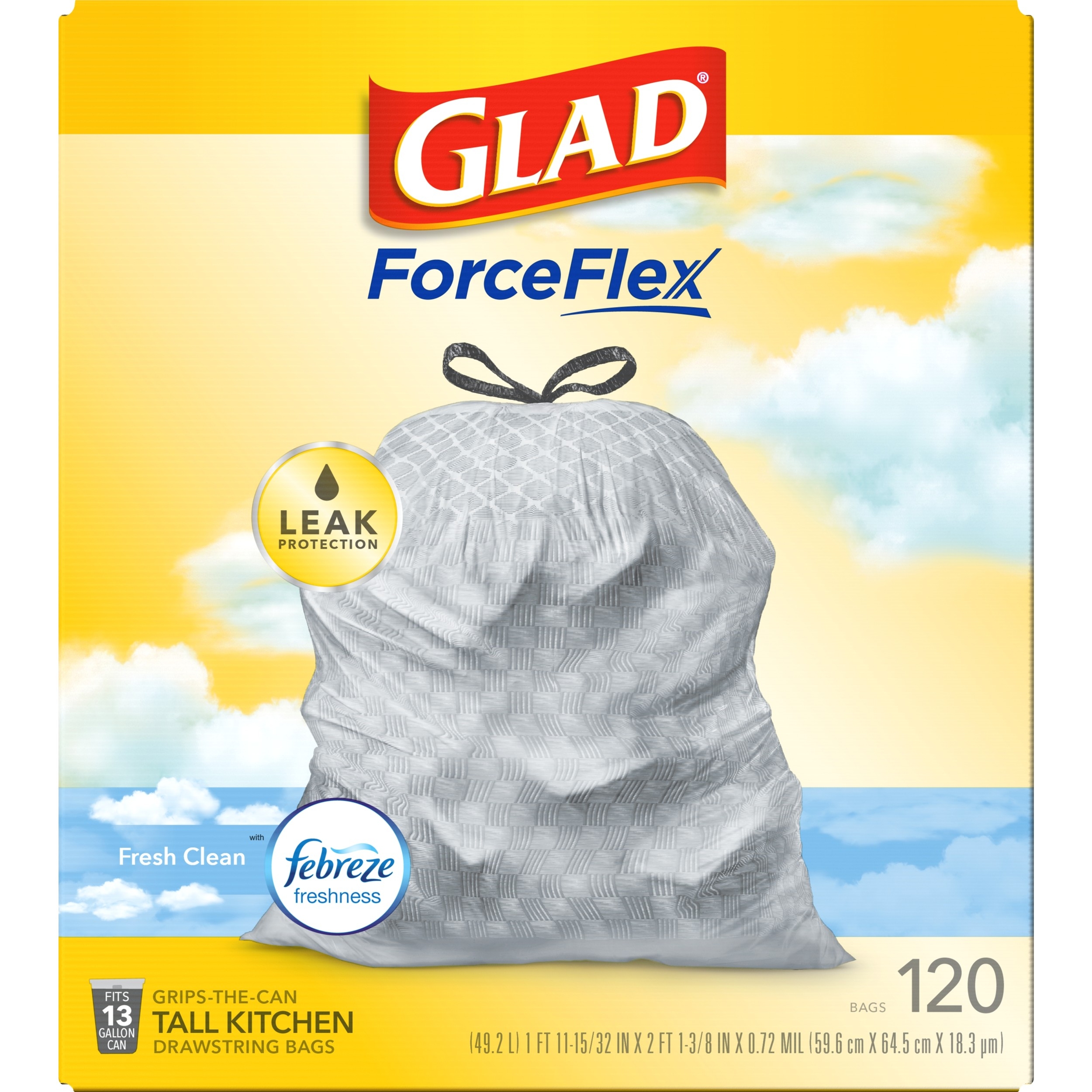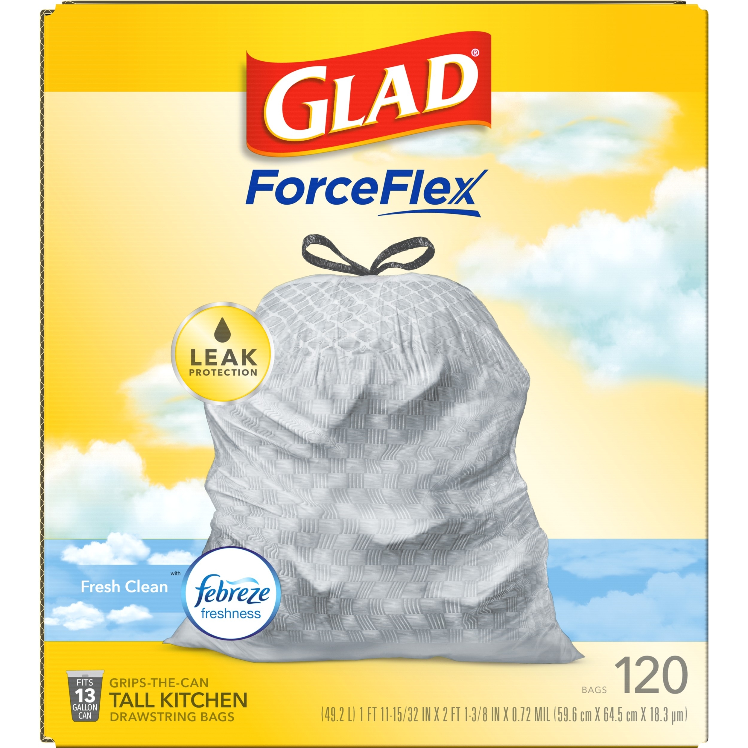 Fight nasty kitchen odors with Glad trash bags and the steady release of Febreze freshness. Glad Tall Kitchen Drawstring Trash Bags are designed with ForceFlex technology to give extra flex as it expands around sharp edges and heavy loads, so you can pack it in while resisting tears, rips and punctures. A steady release a Fresh Clean scent with Febreze Freshness keeps your kitchen pleasantly fresh smelling with long lasting odor control. Let the stretchable strength of Glad handle all the messes our busy daily life can throw at it and then some. With double-sided seals and a reinforced bottom, these bags are designed with RipGuard and LeakGuard technology to prevent seepage of liquids and keep trash contained. The durable Grips-The-Can Drawstring ensures a tight grip on the trash can to keep it in place. Take the trash to the curb with no fear of leaks and tears, and no frustration. Keep your kitchen smelling clean with the stretchable strength of Glad.