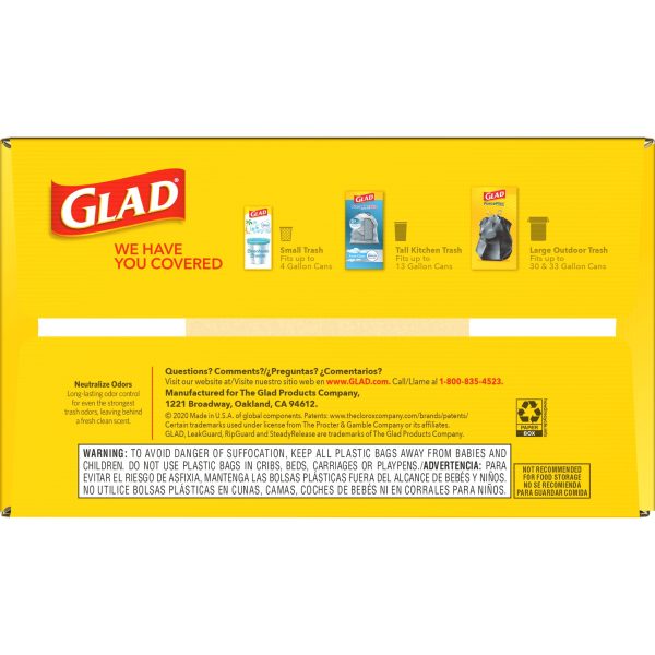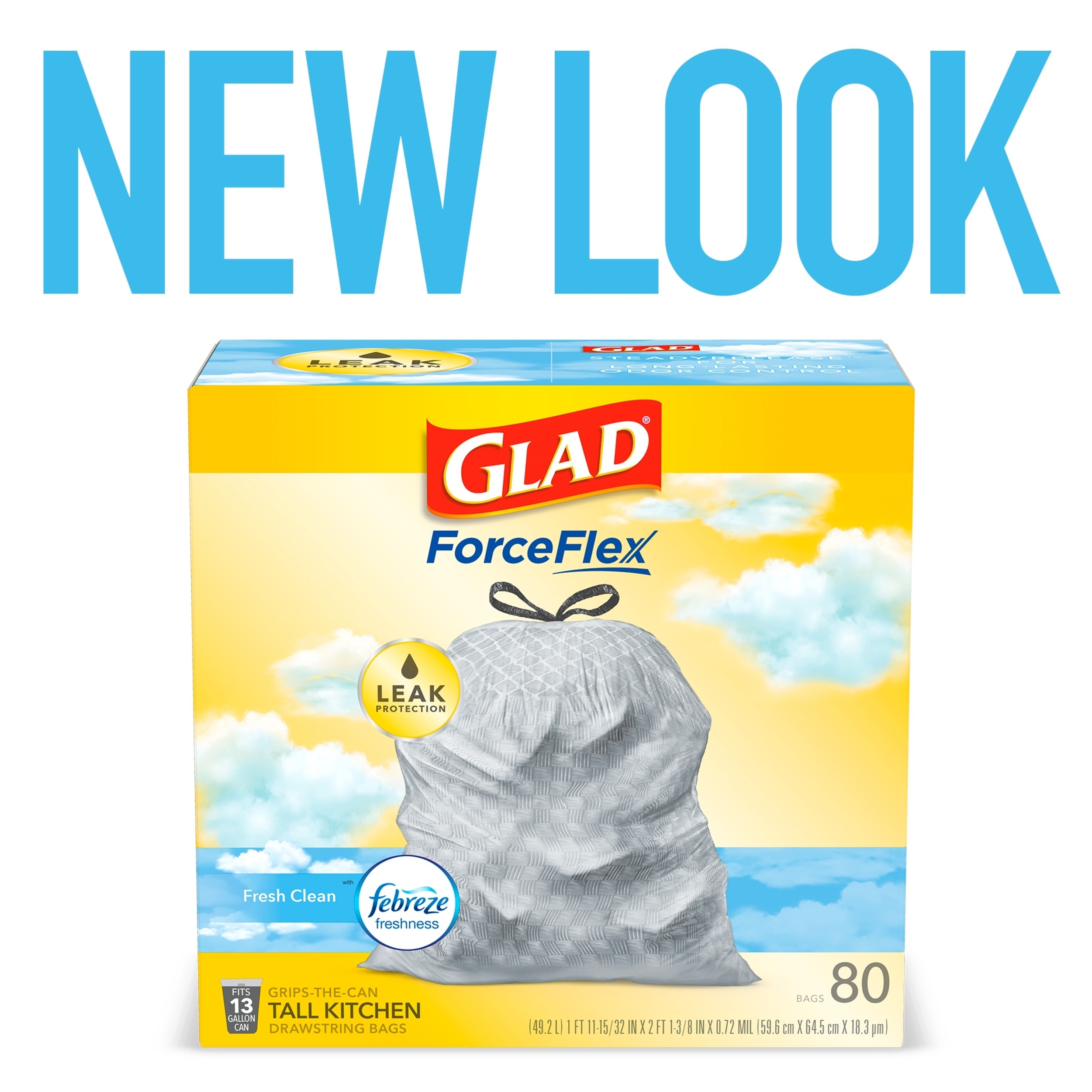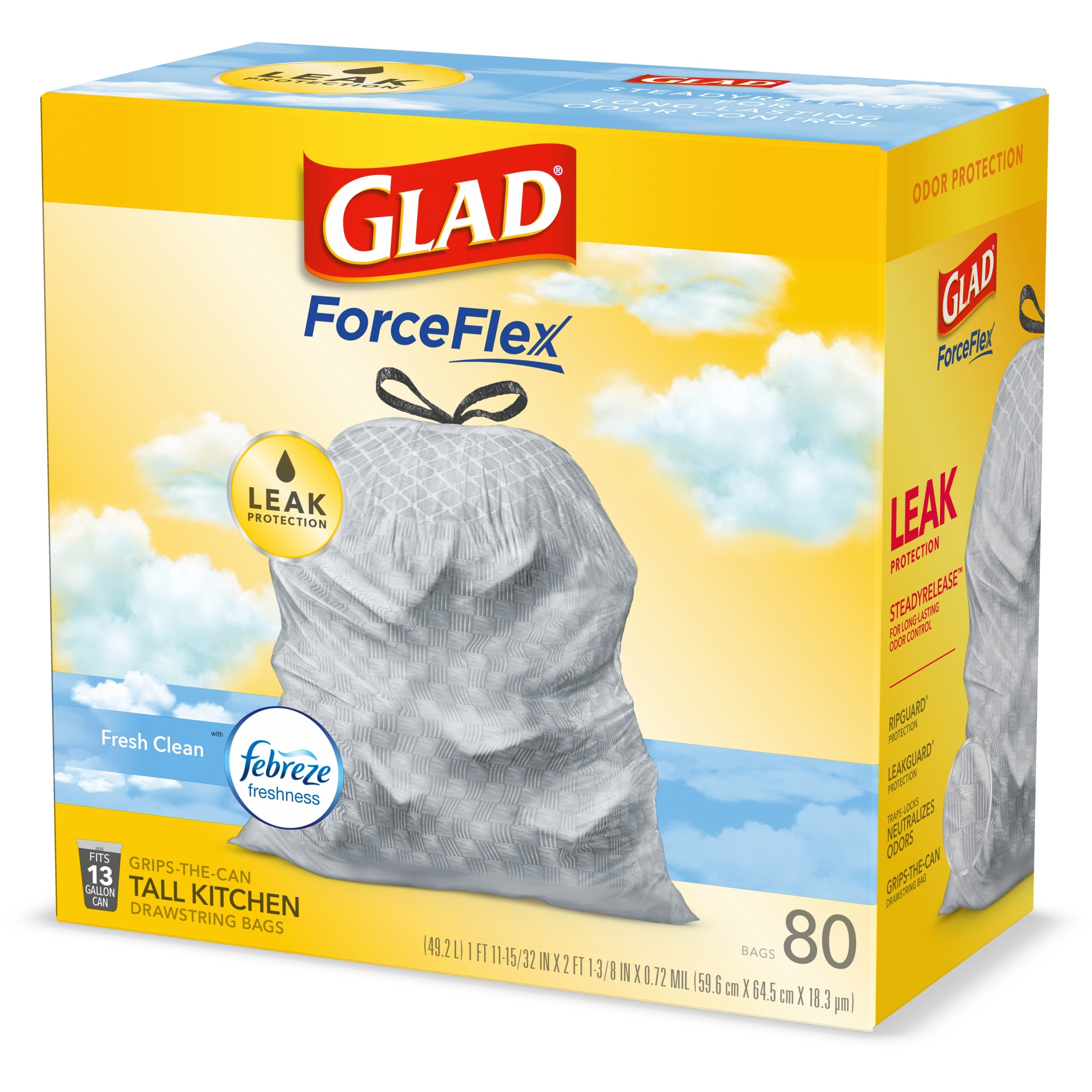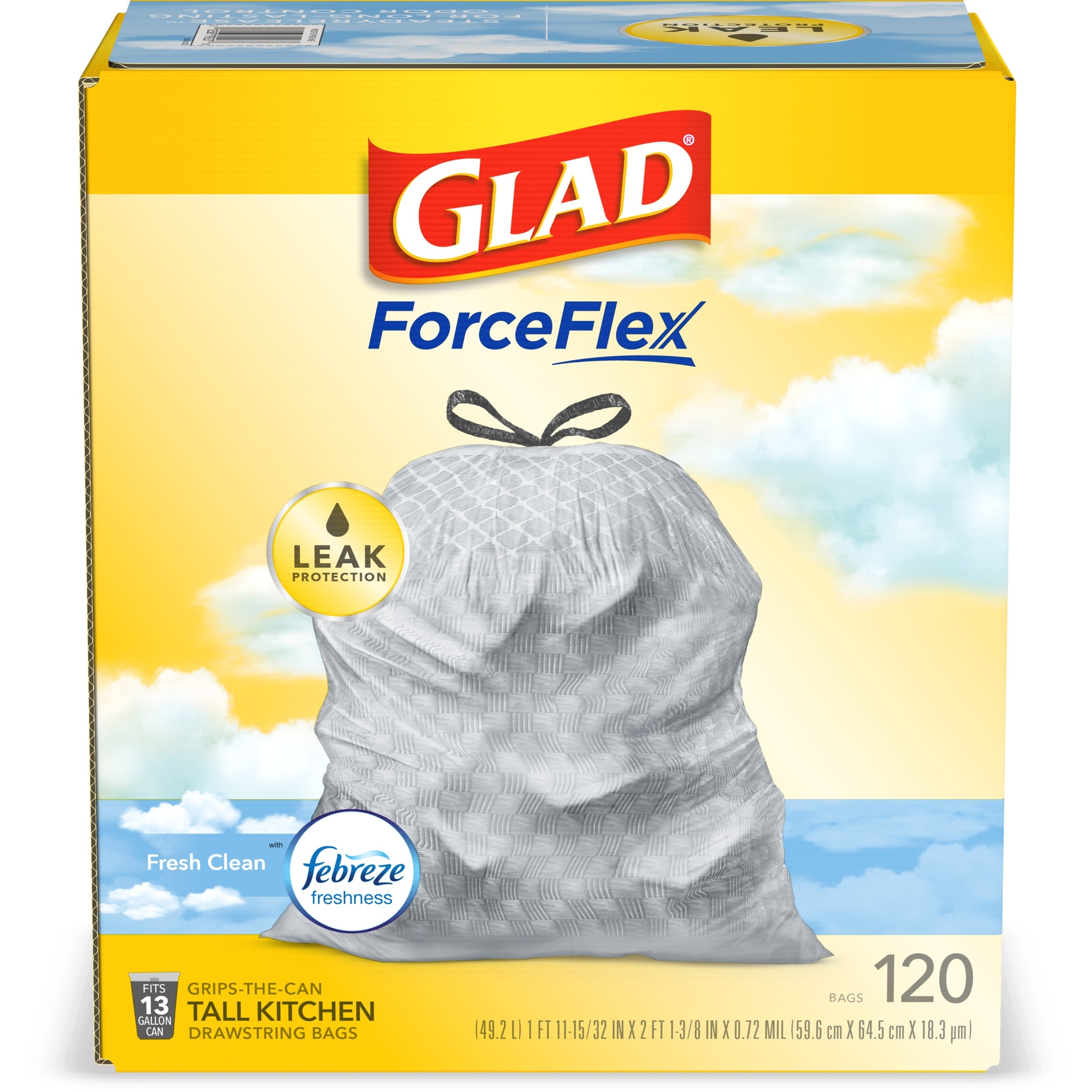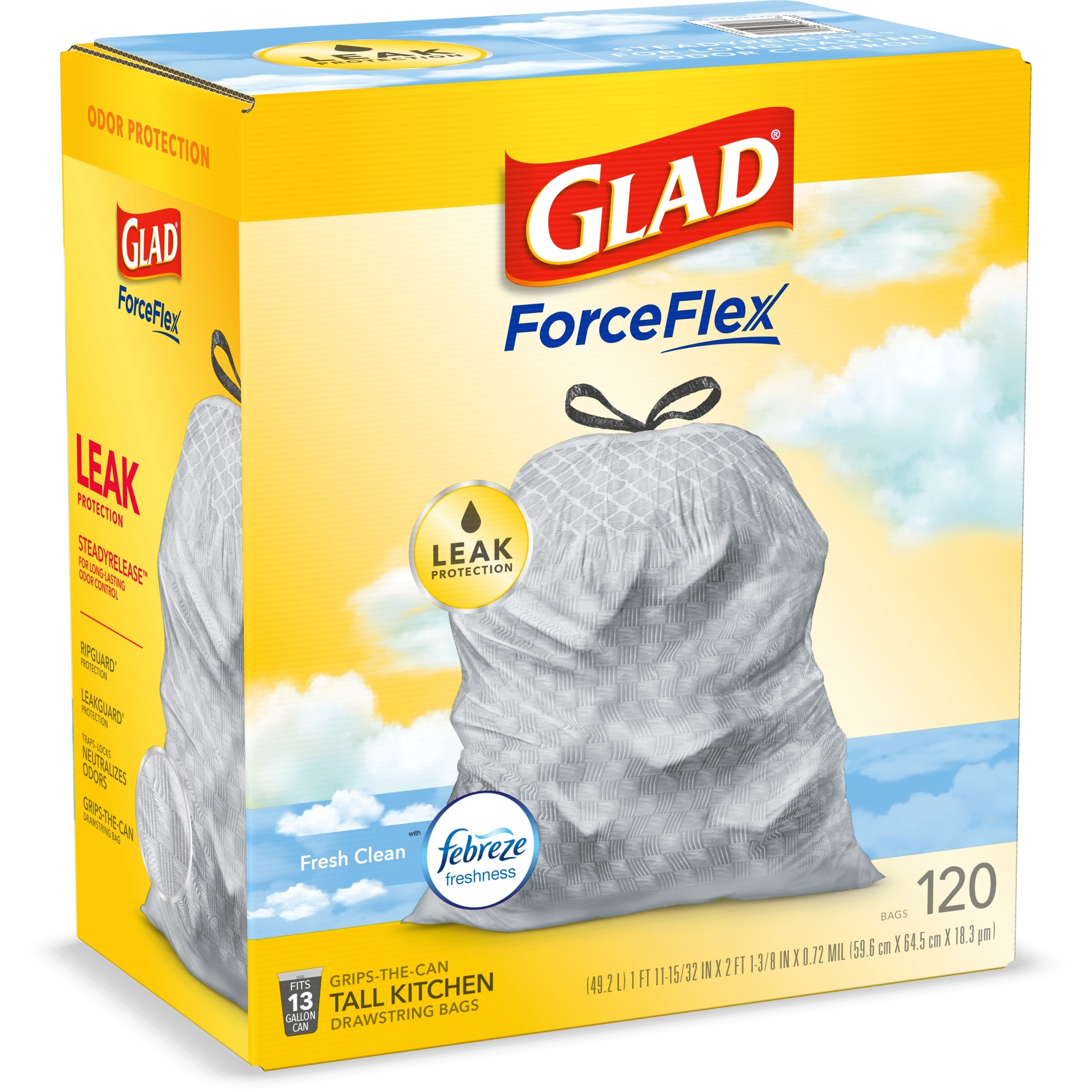 Fight nasty kitchen odors with Glad trash bags and the steady release of Febreze freshness. Glad Tall Kitchen Drawstring Trash Bags are designed with ForceFlex technology to give extra flex as it expands around sharp edges and heavy loads, so you can pack it in while resisting tears, rips and punctures. A steady release a Fresh Clean scent with Febreze Freshness keeps your kitchen pleasantly fresh smelling with long lasting odor control. Let the stretchable strength of Glad handle all the messes our busy daily life can throw at it and then some. With double-sided seals and a reinforced bottom, these bags are designed with RipGuard and LeakGuard technology to prevent seepage of liquids and keep trash contained. The durable Grips-The-Can Drawstring ensures a tight grip on the trash can to keep it in place. Take the trash to the curb with no fear of leaks and tears, and no frustration. Keep your kitchen smelling clean with the stretchable strength of Glad.