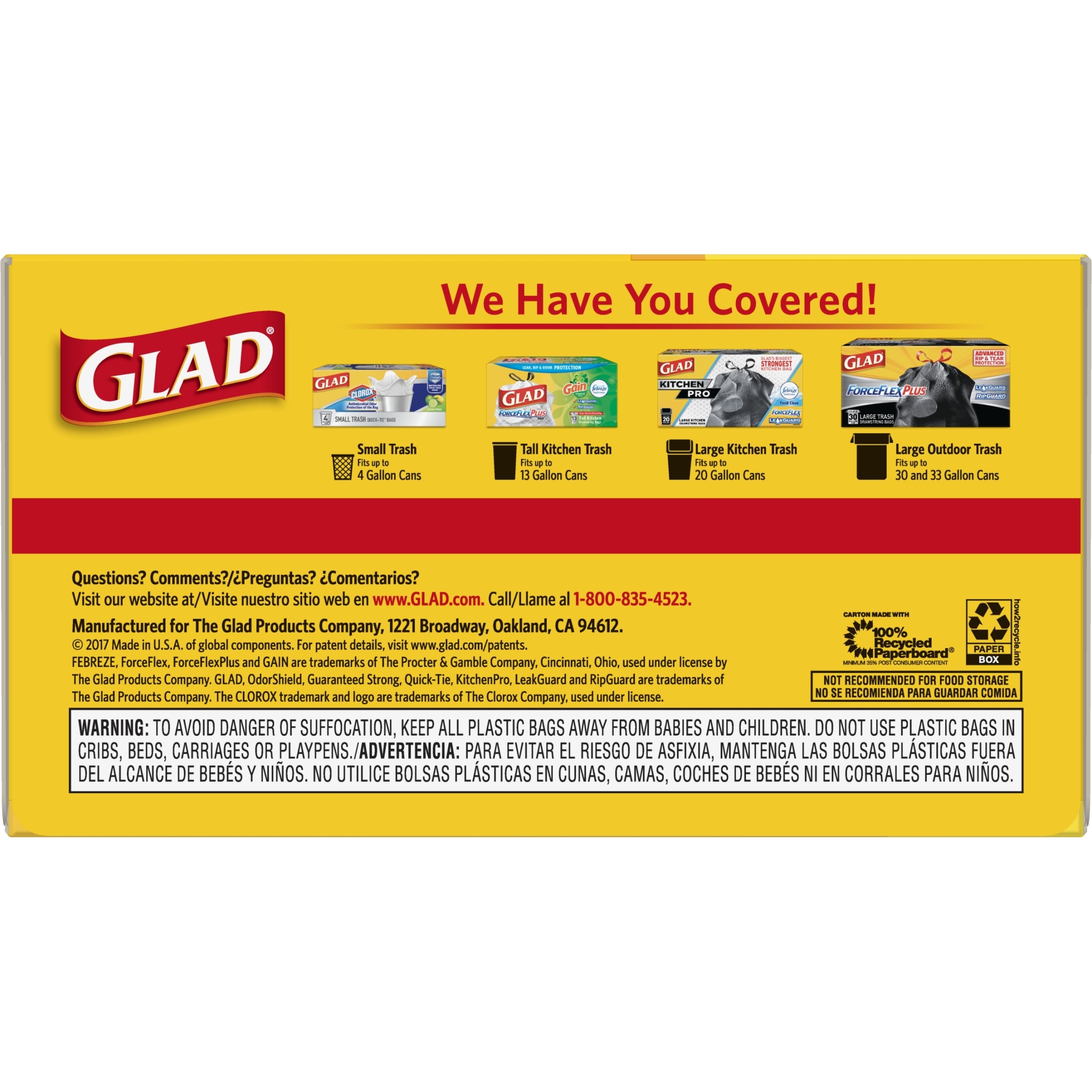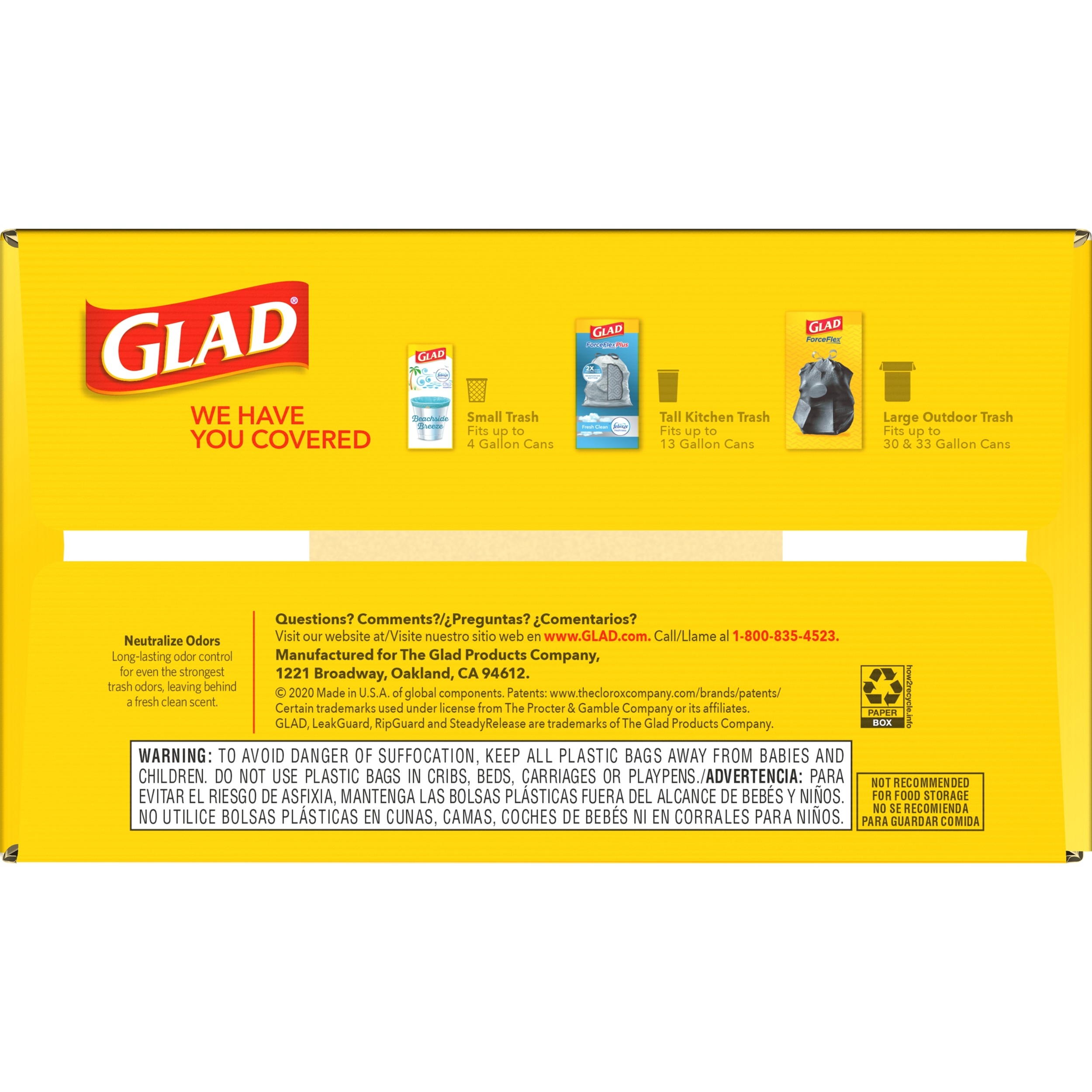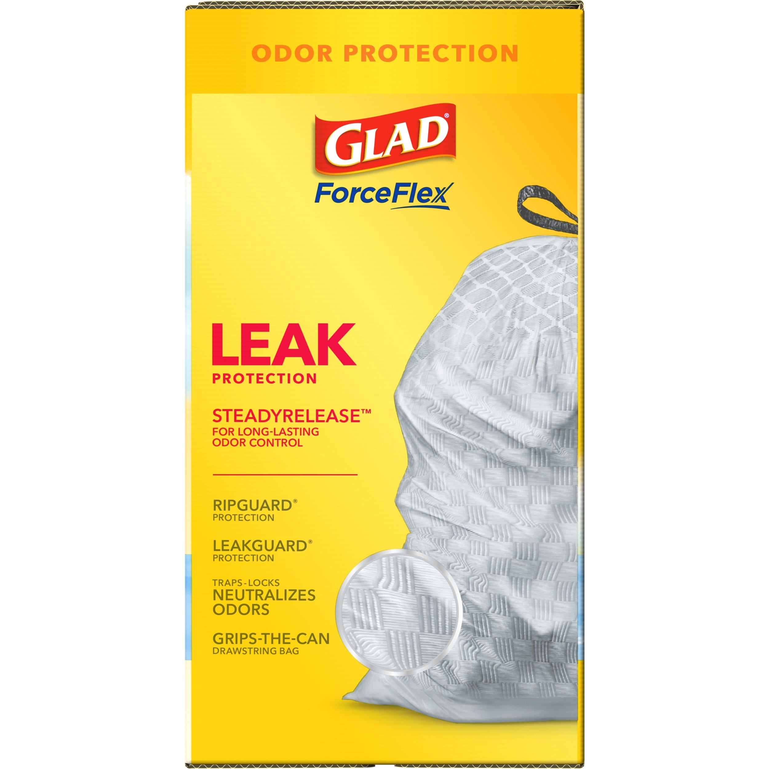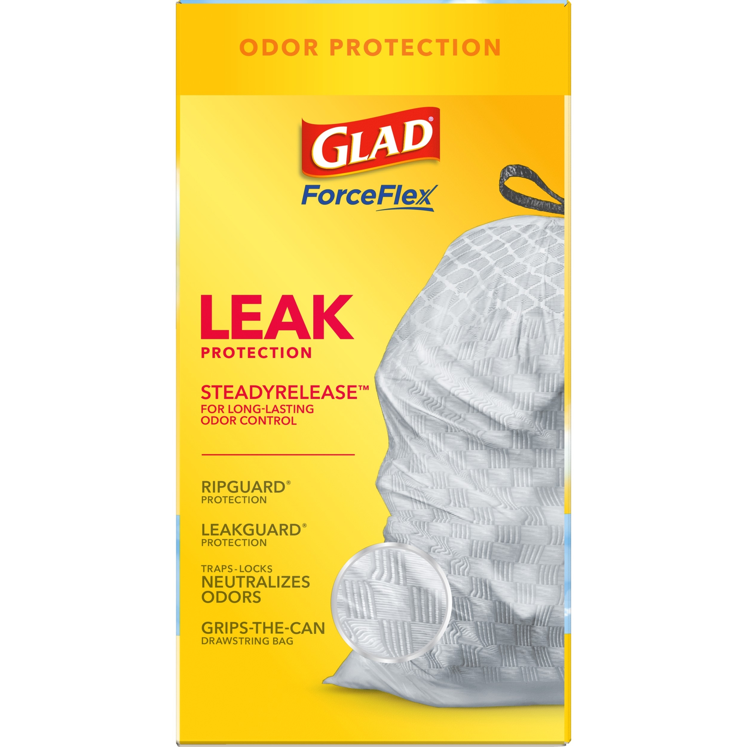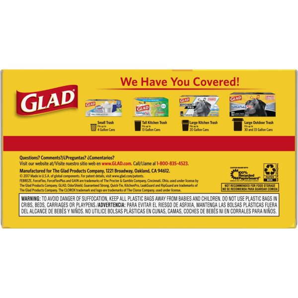 Fight nasty kitchen odors with Glad trash bags and the steady release of Febreze freshness. Glad Tall Kitchen Drawstring Trash Bags are designed with ForceFlex technology to give extra flex as it expands around sharp edges and heavy loads, so you can pack it in while resisting tears, rips and punctures. A steady release a Fresh Clean scent with Febreze Freshness keeps your kitchen pleasantly fresh smelling with long lasting odor control. Let the stretchable strength of Glad handle all the messes our busy daily life can throw at it and then some. With double-sided seals and a reinforced bottom, these bags are designed with RipGuard and LeakGuard technology to prevent seepage of liquids and keep trash contained. The durable Grips-The-Can Drawstring ensures a tight grip on the trash can to keep it in place. Take the trash to the curb with no fear of leaks and tears, and no frustration. Keep your kitchen smelling clean with the stretchable strength of Glad.