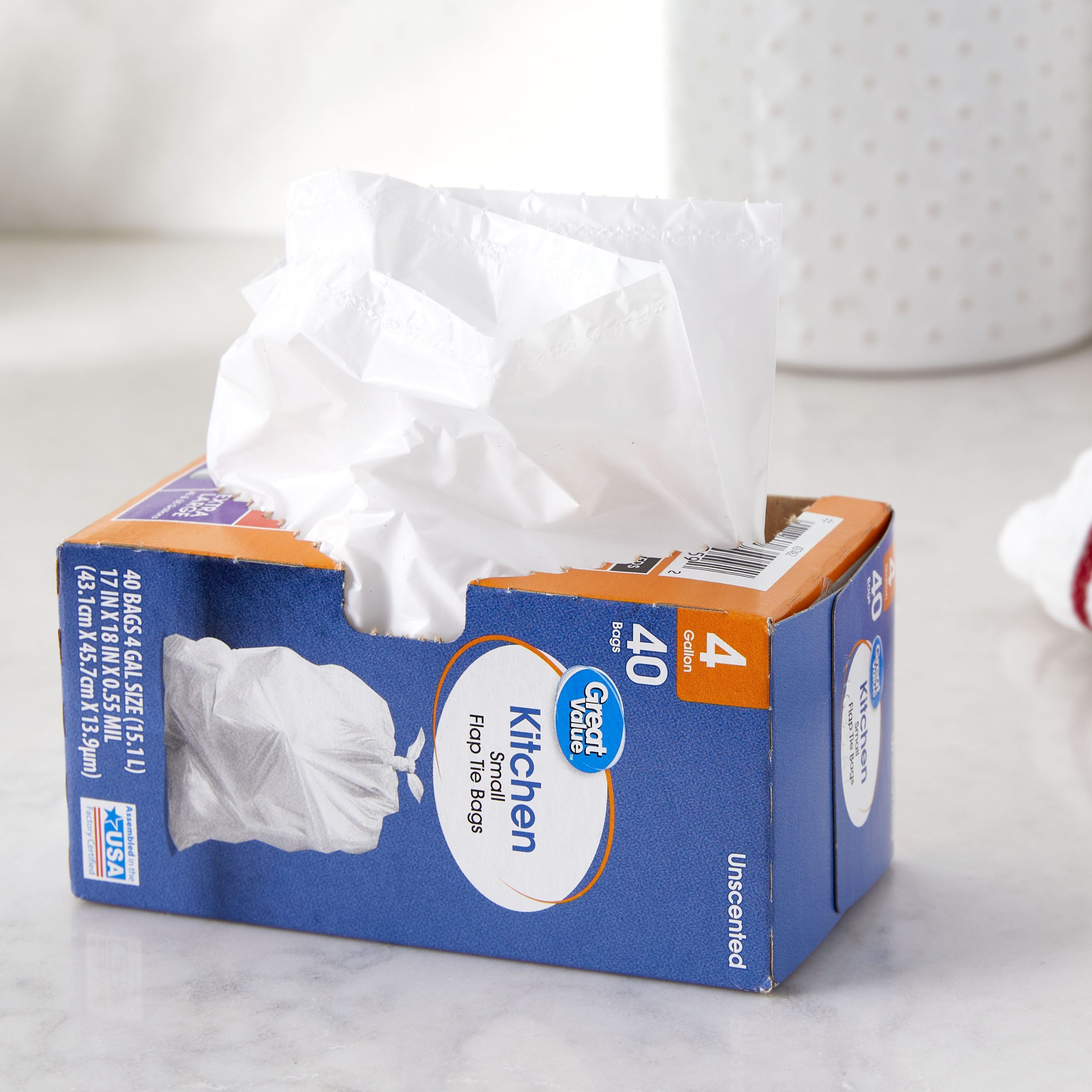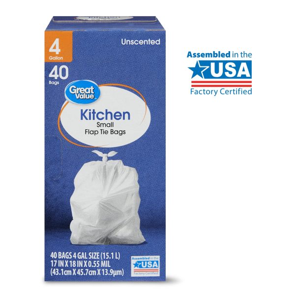 Our Great Value Small Flap Tie Kitchen Bags are an easy and convenient way to dispose of trash. These bags are very durable and feature a flap tie that makes it simple to tie up your trash, lift it out of its can, carry it to the curb, and toss it away. The four-gallon size is ideal for everyday use in the kitchen, at the office, or in a dorm room. Keep your home clean and tidy with our unscented Great Value Small Flap Tie Kitchen Bags.
