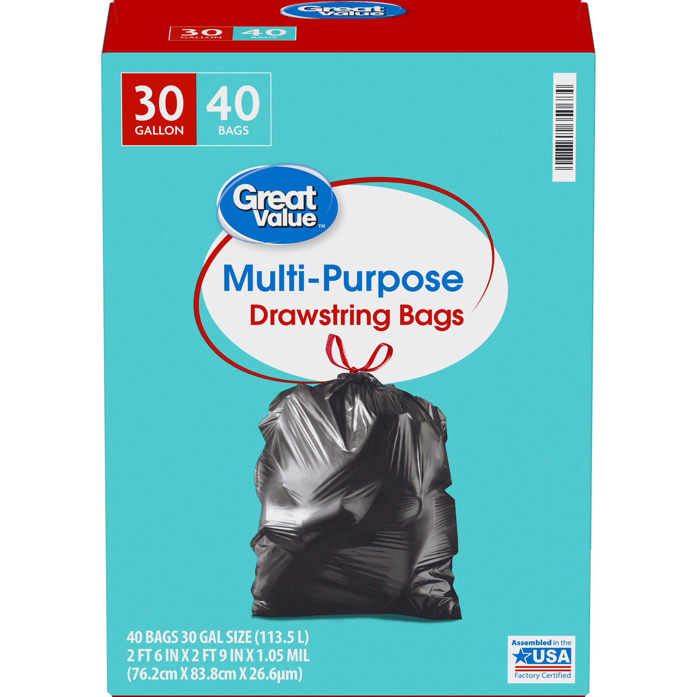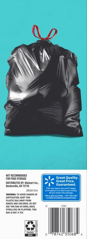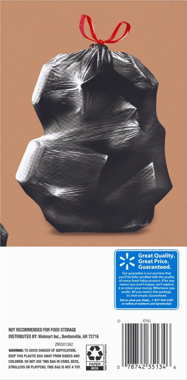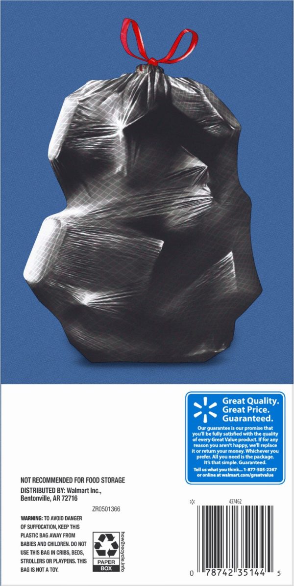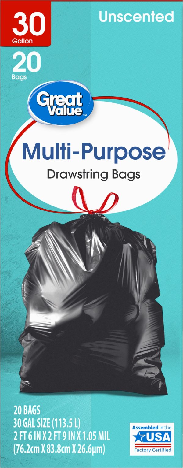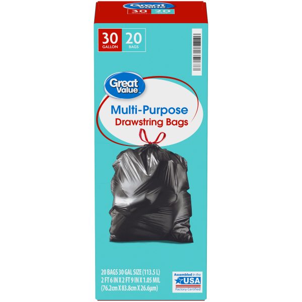 Take charge of large trash loads with Great Value Multi-Purpose Drawstring Trash Bags. The dark color keeps unsightly waste out of view and the drawstring tie makes for easy and secure closure. Check out other Great Value products for all of your cleaning and organizing needs. Take control of garbage with Great Value Multi-Purpose Drawstring Trash Bags. Great Value products provide families with affordable, high-quality grocery and household consumable options. With our wide range of product categories spanning grocery and household consumables, we offer you a variety of products for your family’s needs. Our products are conveniently available online and in Walmart stores nationwide, allowing you to stock up and save money at the same time.