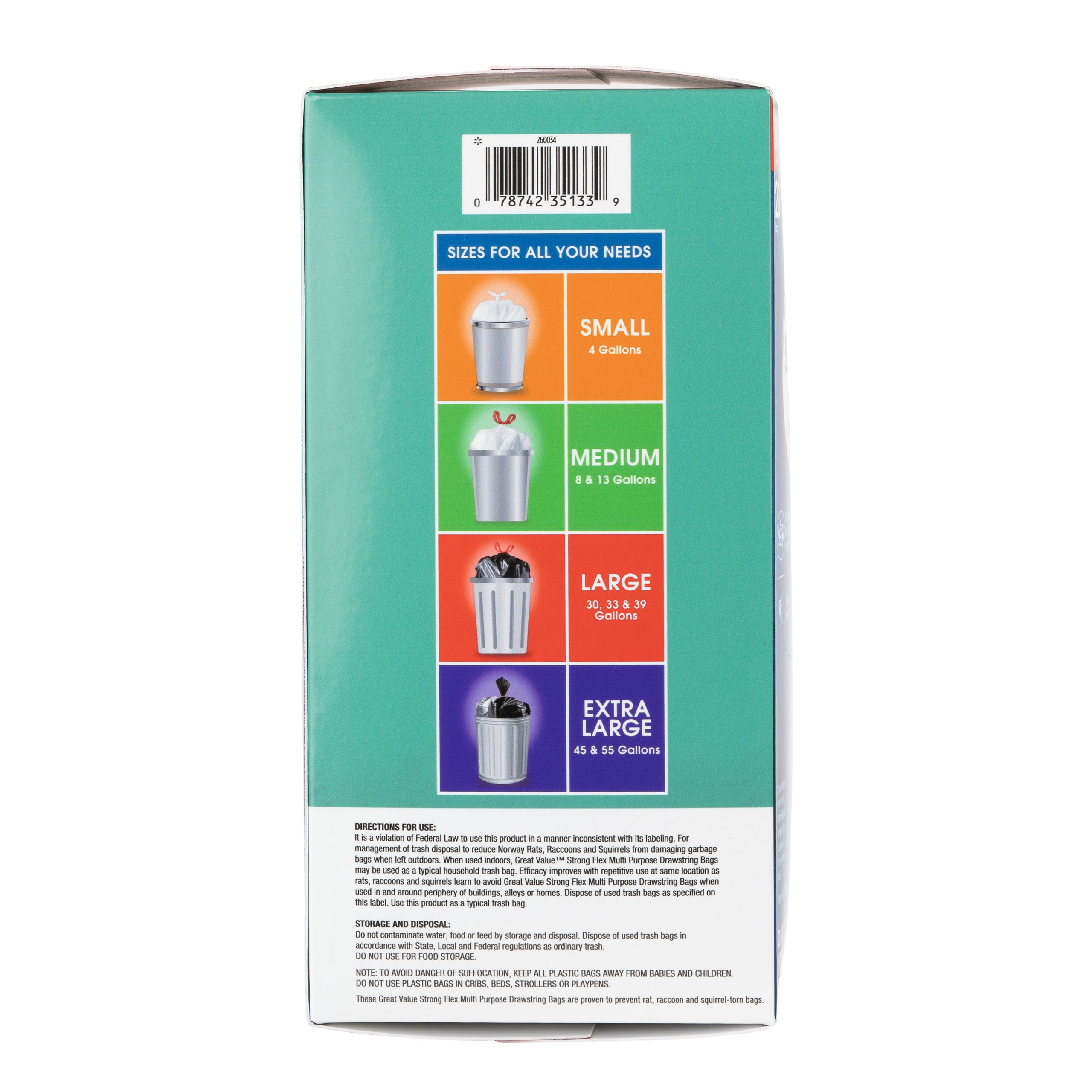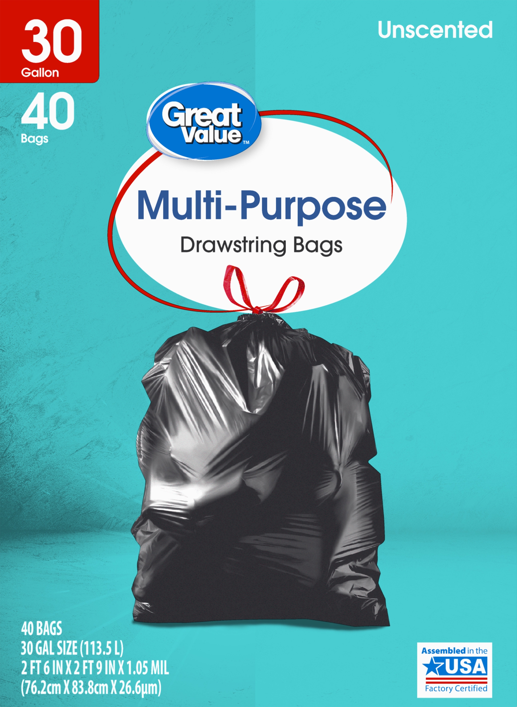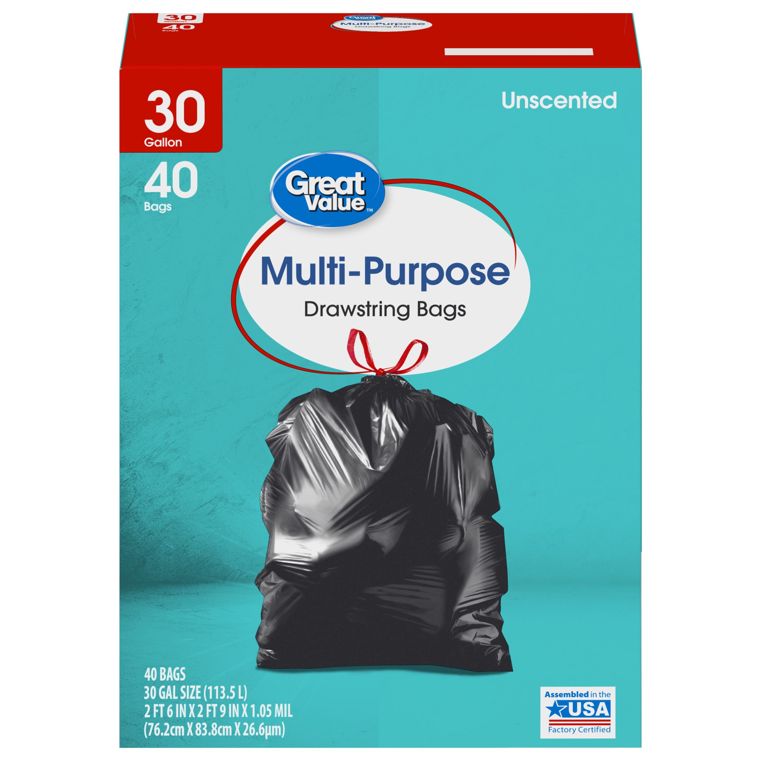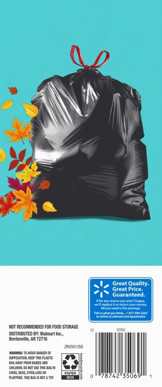 Take charge of large trash loads with Great Value Multi-Purpose Drawstring Trash Bags. The dark color keeps unsightly waste out of view and the drawstring tie makes for easy and secure closure. Check out other Great Value products for all of your cleaning and organizing needs. Take control of garbage with Great Value Multi-Purpose Drawstring Trash Bags. Great Value products provide families with affordable, high-quality grocery and household consumable options. With our wide range of product categories spanning grocery and household consumables, we offer you a variety of products for your family’s needs. Our products are conveniently available online and in Walmart stores nationwide, allowing you to stock up and save money at the same time.