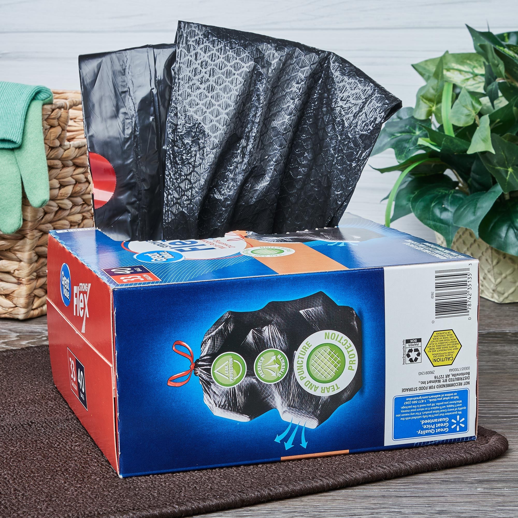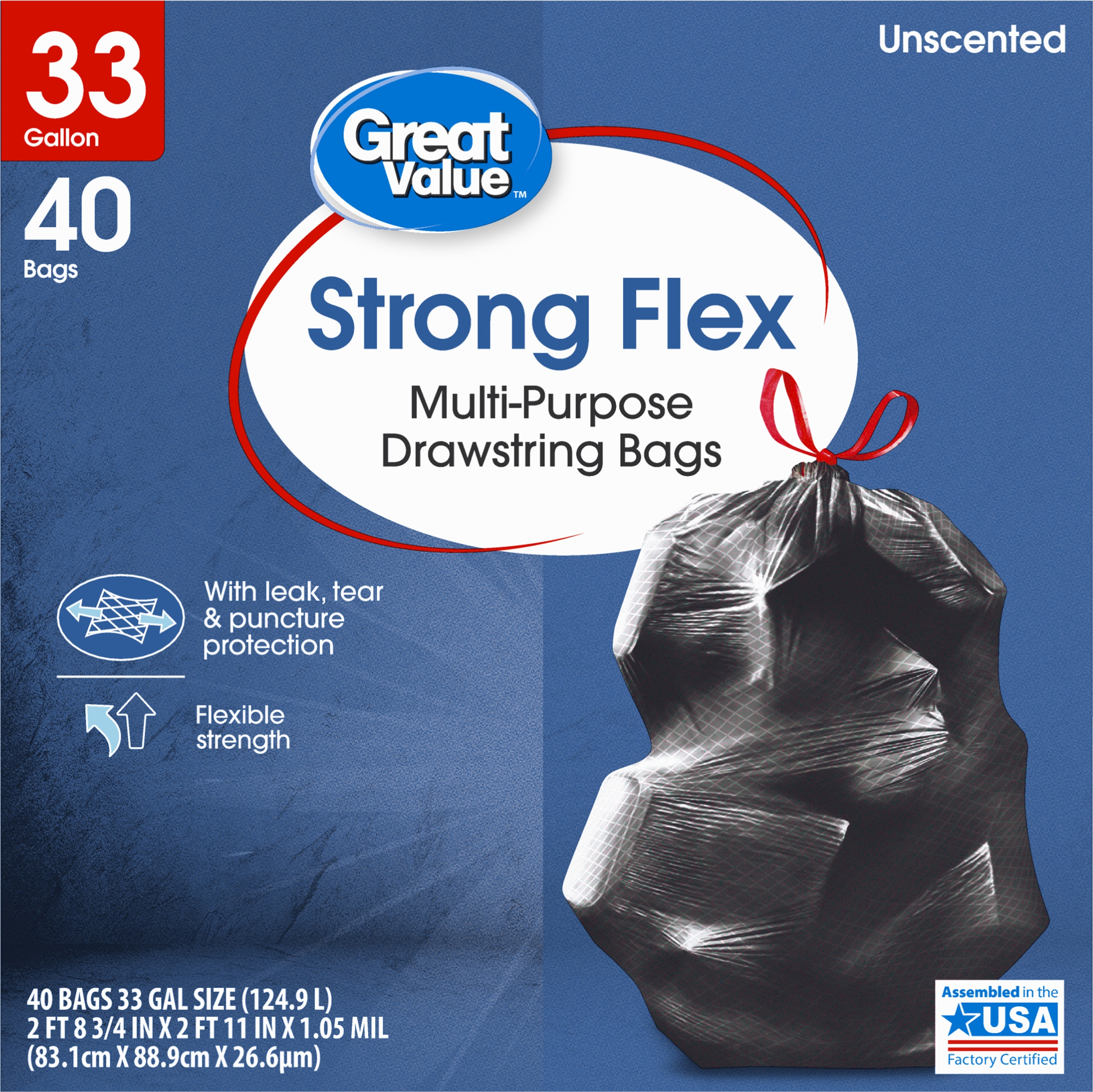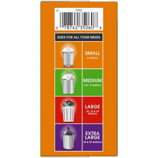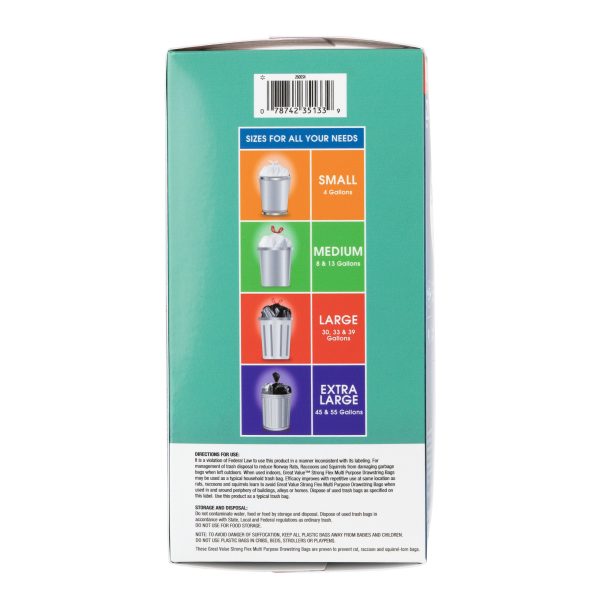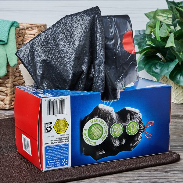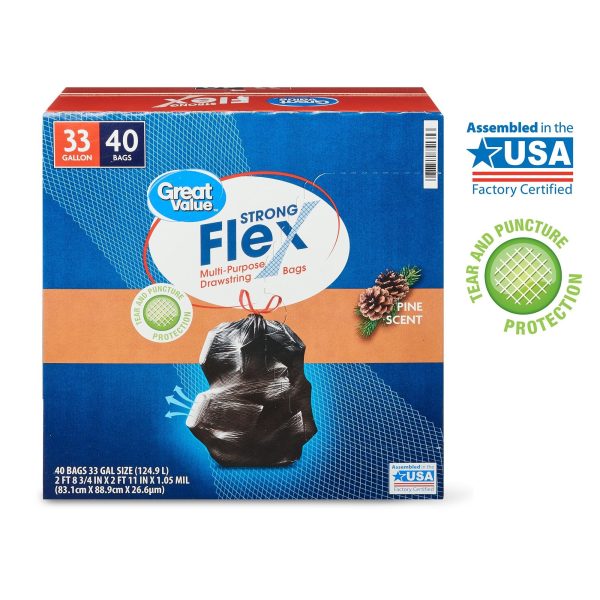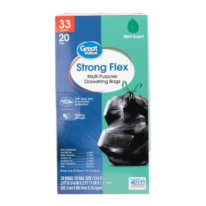 Great Value Multi Purpose Strong Flex Trash Bags an easy and convenient way to store and dispose of your trash. Designed for everyday use, these bags are made to resist rips and tears even when used at the maximum load. The Strong Flex bags are stronger than regular kitchen trash bags and their 33 gallon size is great for tidying up after parties or for use in the kitchen over several days. Their drawstring closure makes them easy to tie, lift and carry and their refreshing scent keeps your home smelling clean whether you’ve just changed the trash out or it’s time to do so.