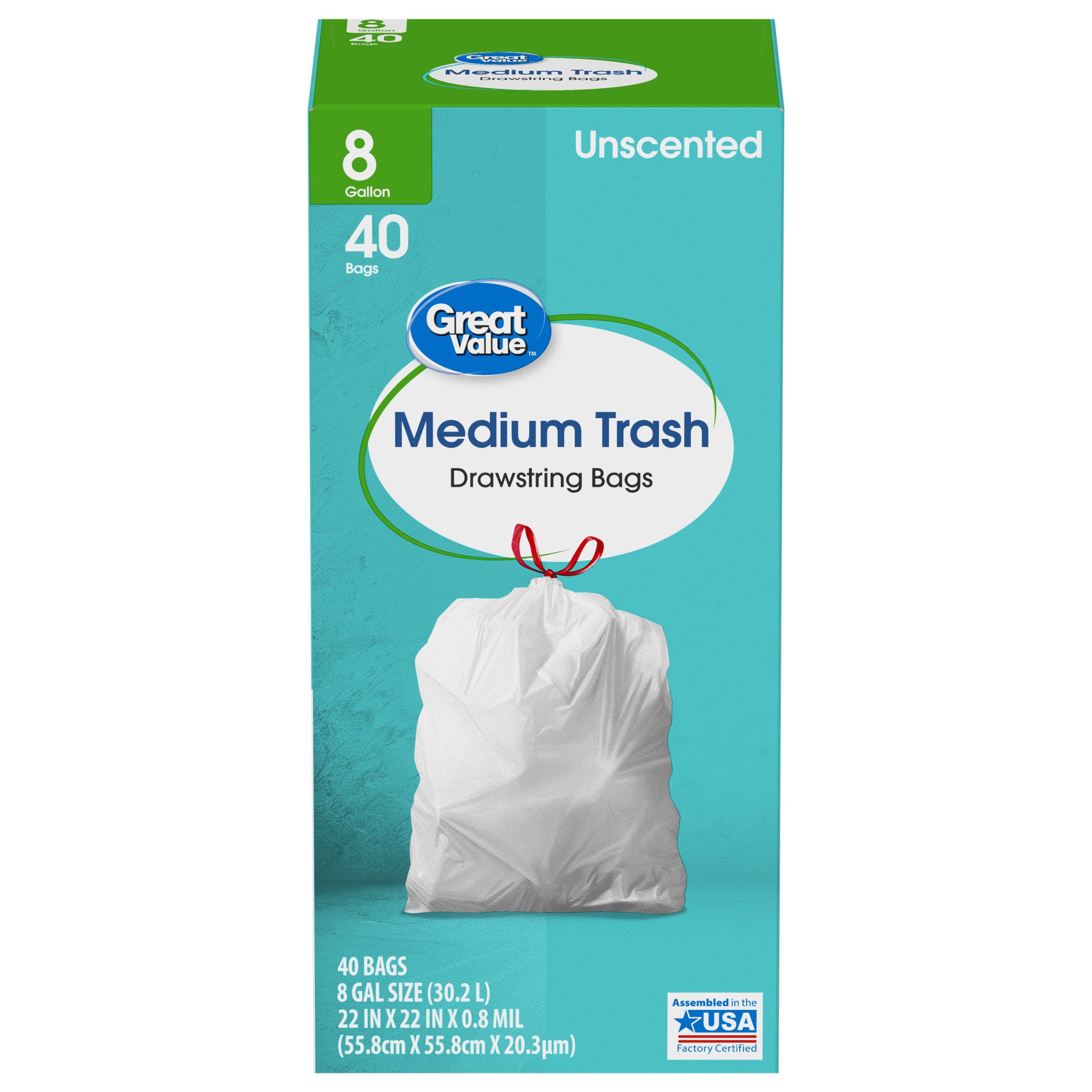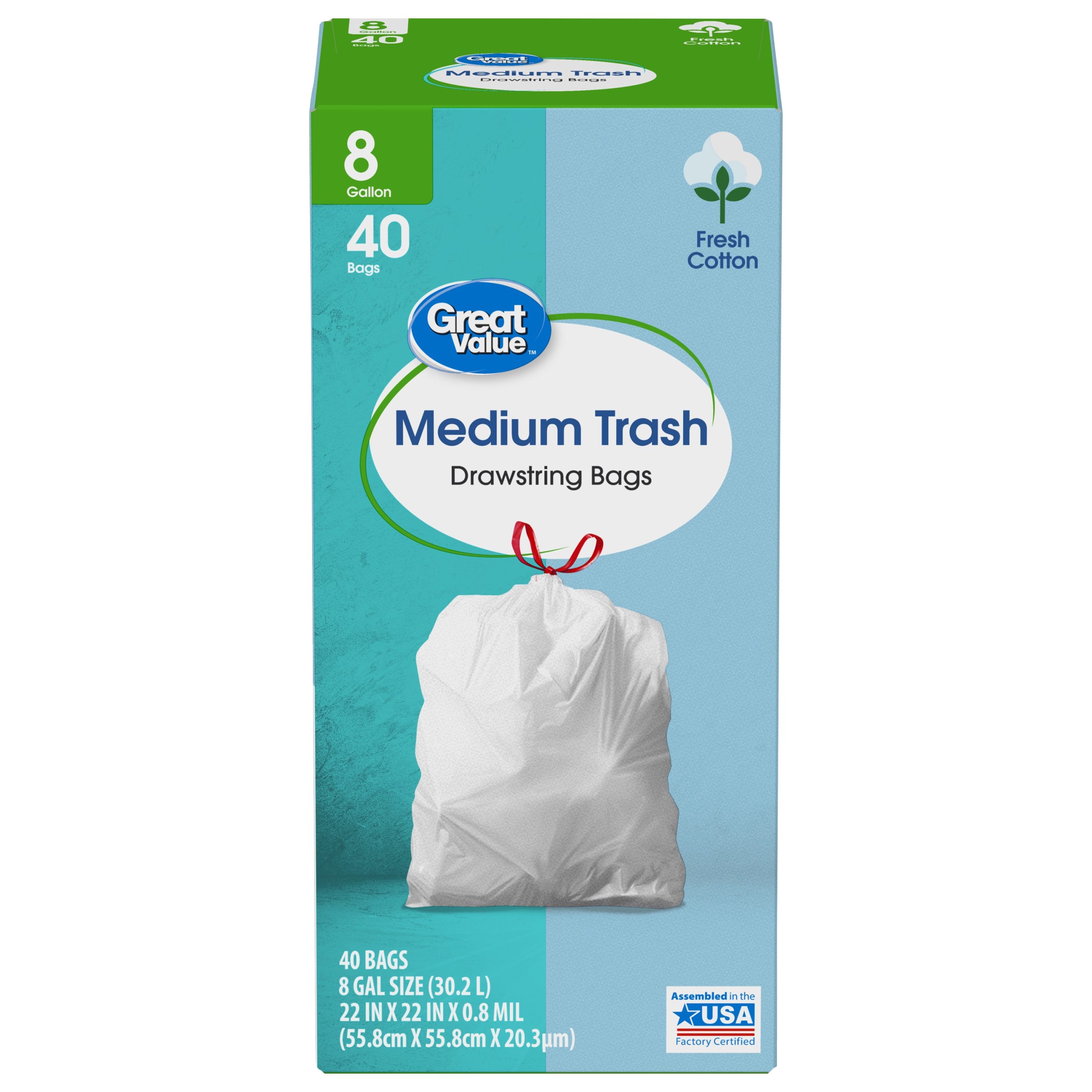 Great Value Medium Drawstring Trash Bags, Fresh Cotton Scent, 8 Gallon, 40 Count