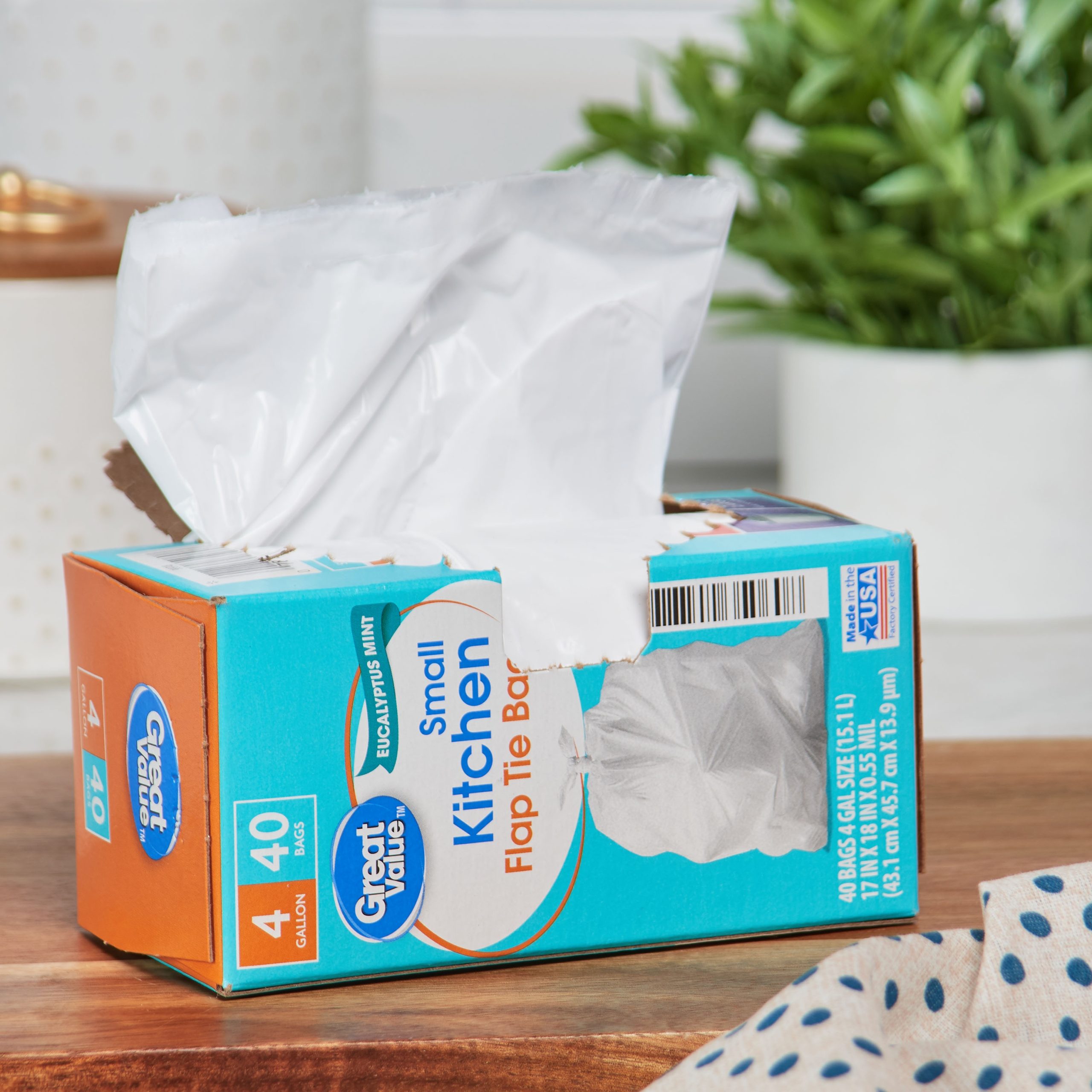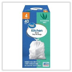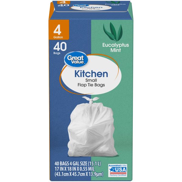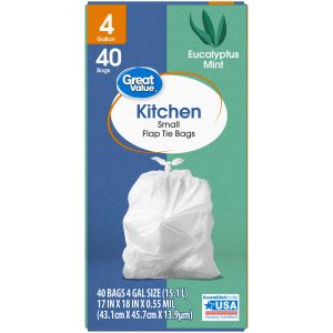Great Value Small Kitchen Flap Tie Trash Bags with Eucalyptus Mint Scent are an easy and convenient way to dispose of your trash. These bags are very durable, and they feature a flap tie that makes trash easy to tie up, lift, carry, and toss away. The four-gallon size is ideal for everyday use in the kitchen, at the office, or at school. Keep your house clean and tidy with these unscented Great Value Small Kitchen Flap Tie Trash Bags. Great Value products provide families with affordable, high-quality grocery and household consumable options. With our wide range of product categories spanning grocery and household consumables, we offer you a variety of products for your family’s needs. Our products are conveniently available online and in Walmart stores nationwide, allowing you to stock up and save money at the same time.