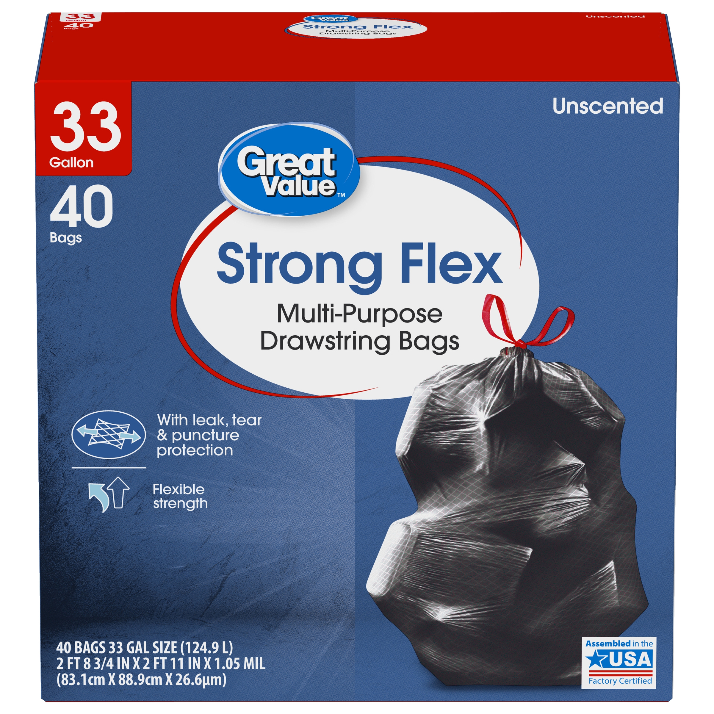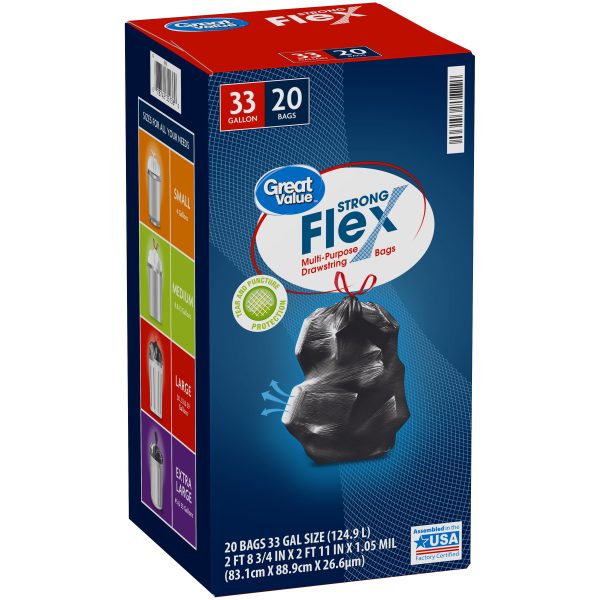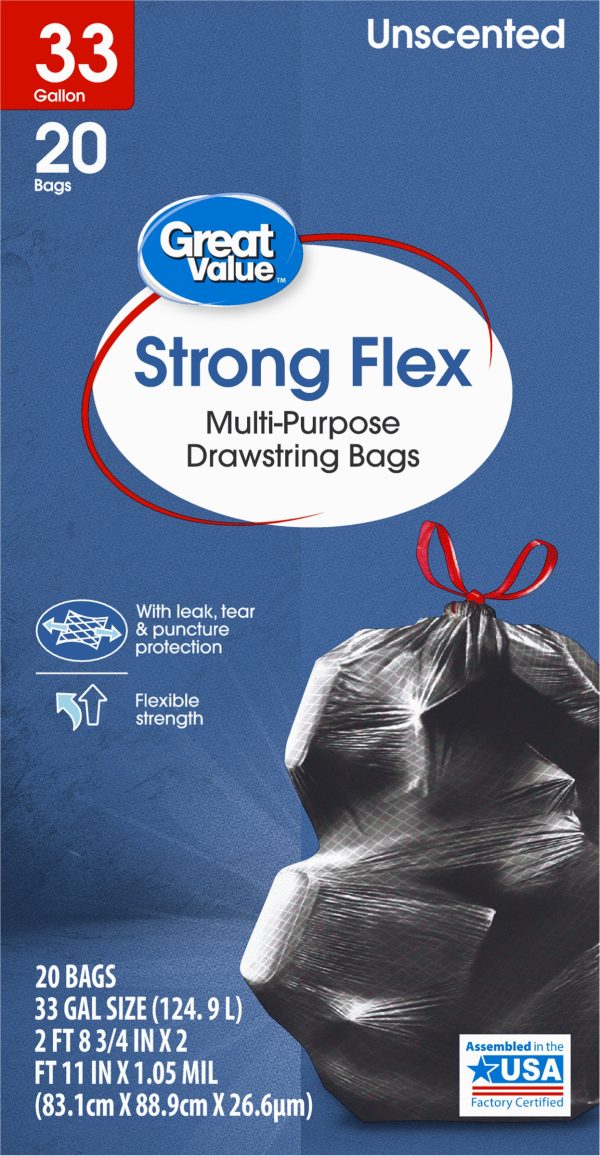 Great Value Strong Flex Multi-Purpose Trash Bags, 33 Gallon, 20 Bags (Unscented, Drawstring)
