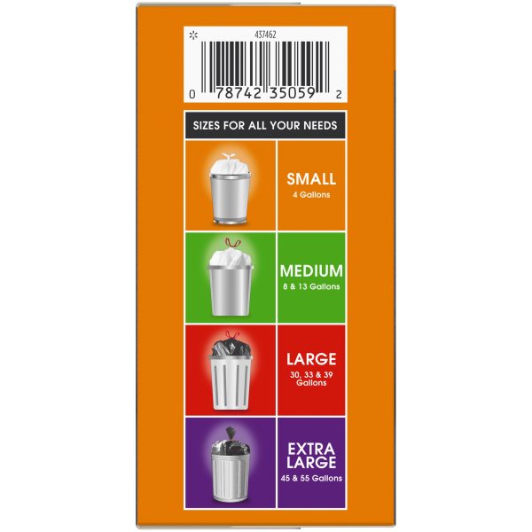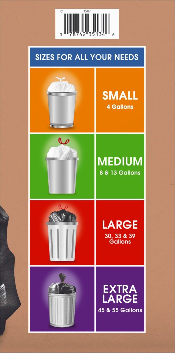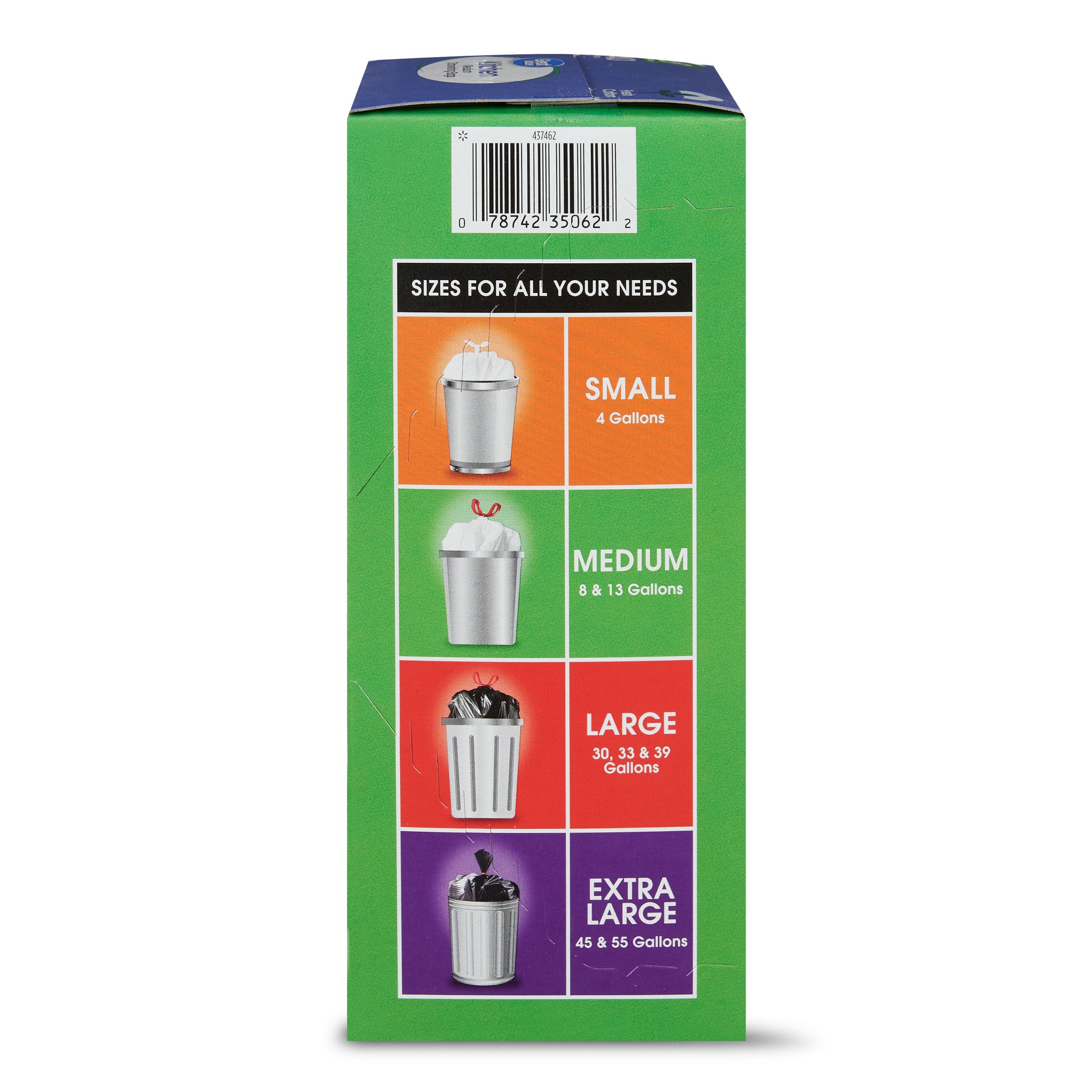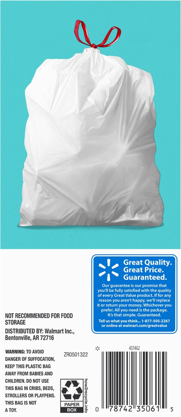 Great Value Medium Kitchen Drawstring Trash Bags are an easy and convenient way to dispose of your trash. These bags are durable and feature a drawstring that makes trash easy to tie up, lift, carry, and toss away. The eight-gallon size is ideal for everyday use in the kitchen, at the office, or at school. Keep your house clean and tidy with these Great Value Medium Kitchen Drawstring Trash Bags. Great Value products provide families with affordable, high-quality grocery and household consumable options. With our wide range of product categories spanning grocery and household consumables, we offer you a variety of products for your family’s needs. Our products are conveniently available online and in Walmart stores nationwide, allowing you to stock up and save money at the same time.