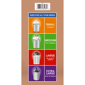 Large 39 gallon capacity black trash bags, Drawstring closure, Ideal for tough yard cleanup and organizing. This package contains 20 large 39 gallon black lawn and leaf trash bags.