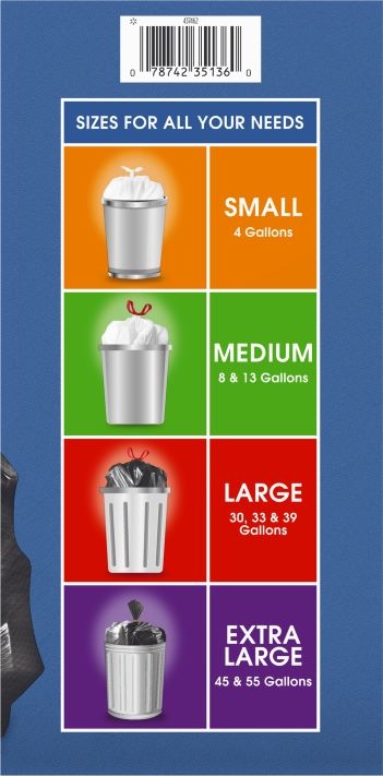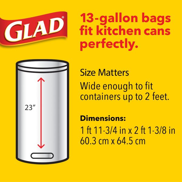 Glad Quick-Tie Trash Bags are designed with strong and dependable Quick-Tie flaps to keep the bag securely shut. The trash bags are built with 3 ply strength to support easy lifting and transporting the fullest load. Avoid messy trash disasters with these sturdy Quick-Tie flaps. With Glad Quick-Tie bags, you can securely and conveniently close the bag by cross tying the flaps. The 13 gallon size is perfect for the kitchen or throughout the house and is great for your seasonal cleaning needs like Spring Cleaning and Back to School. Glad trusted strength at a great value.