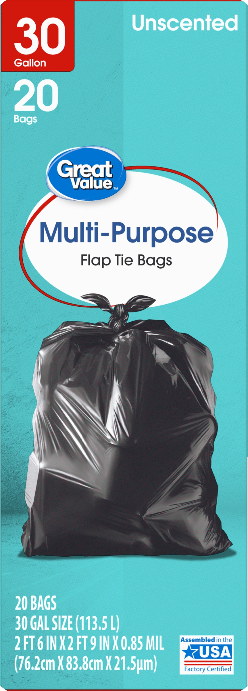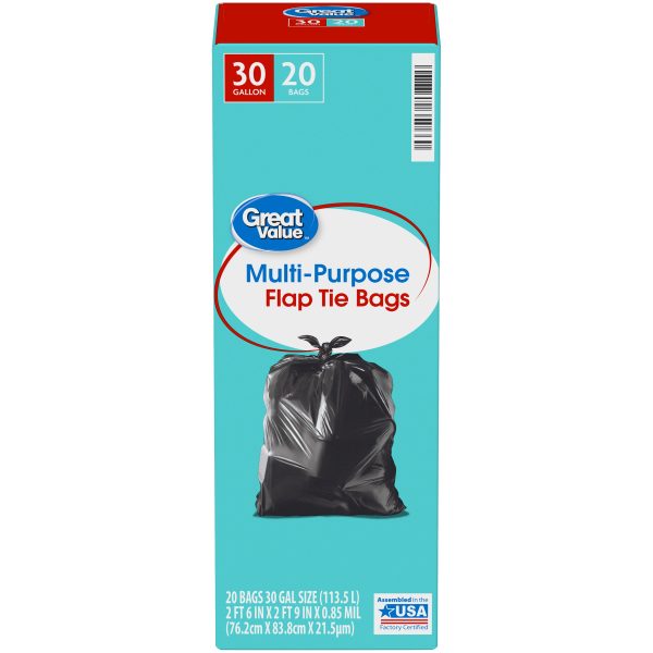 Take charge of large trash loads with Great Value Multi-Purpose Flap Tie Bags. These 30-gallon trash bags have ample space to dispose of bulky loads. Each package comes with 20 strong bags ideal for offices, schools, hotels, hospitals, or outdoor use. The dark color keeps unsightly waste out of view and the flap ties make for easy and secure closure. Take control of garbage with Great Value Multi-Purpose Flap Tie Bags.