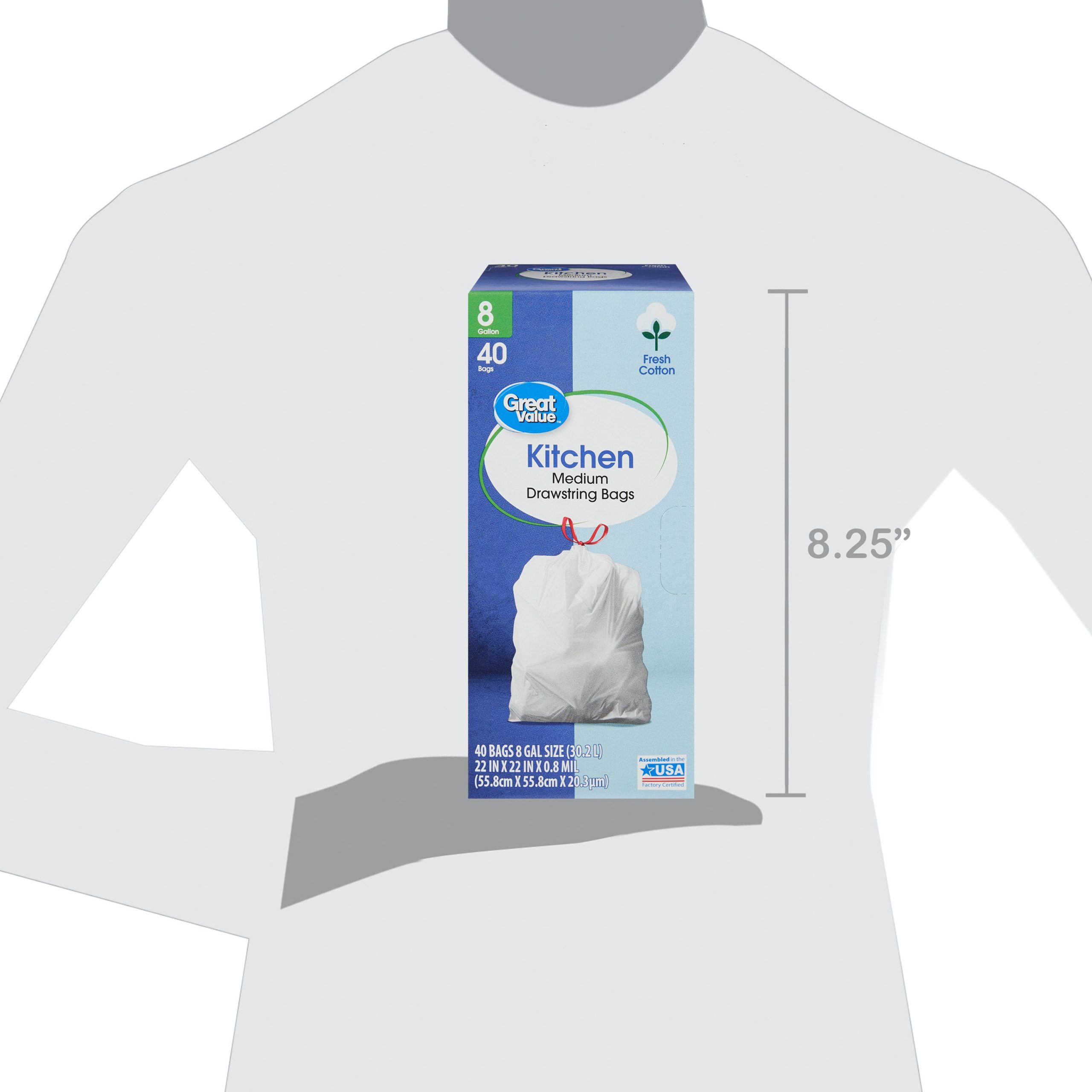 Take charge of daily household demands with our Great Value Medium Drawstring Kitchen Bags with Fresh Cotton Scent. These trash bags have a 8-gallon capacity and are designed to handle everyday trash loads around the house or in the workplace. They are made of strong, tear-resistant plastic and their drawstring closure makes them easy to lift, carry, and toss away. Each box comes with 40 bags to provide you with long-lasting trash control solutions. Check out other Great Value products to satisfy all your cleaning and organizing needs. Keep your home clean and tidy with our Great Value Drawstring Kitchen Bags with Fresh Cotton Scent.