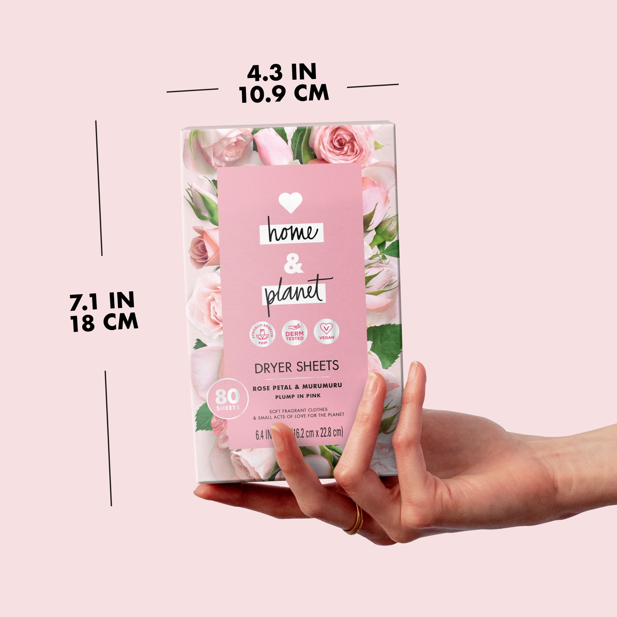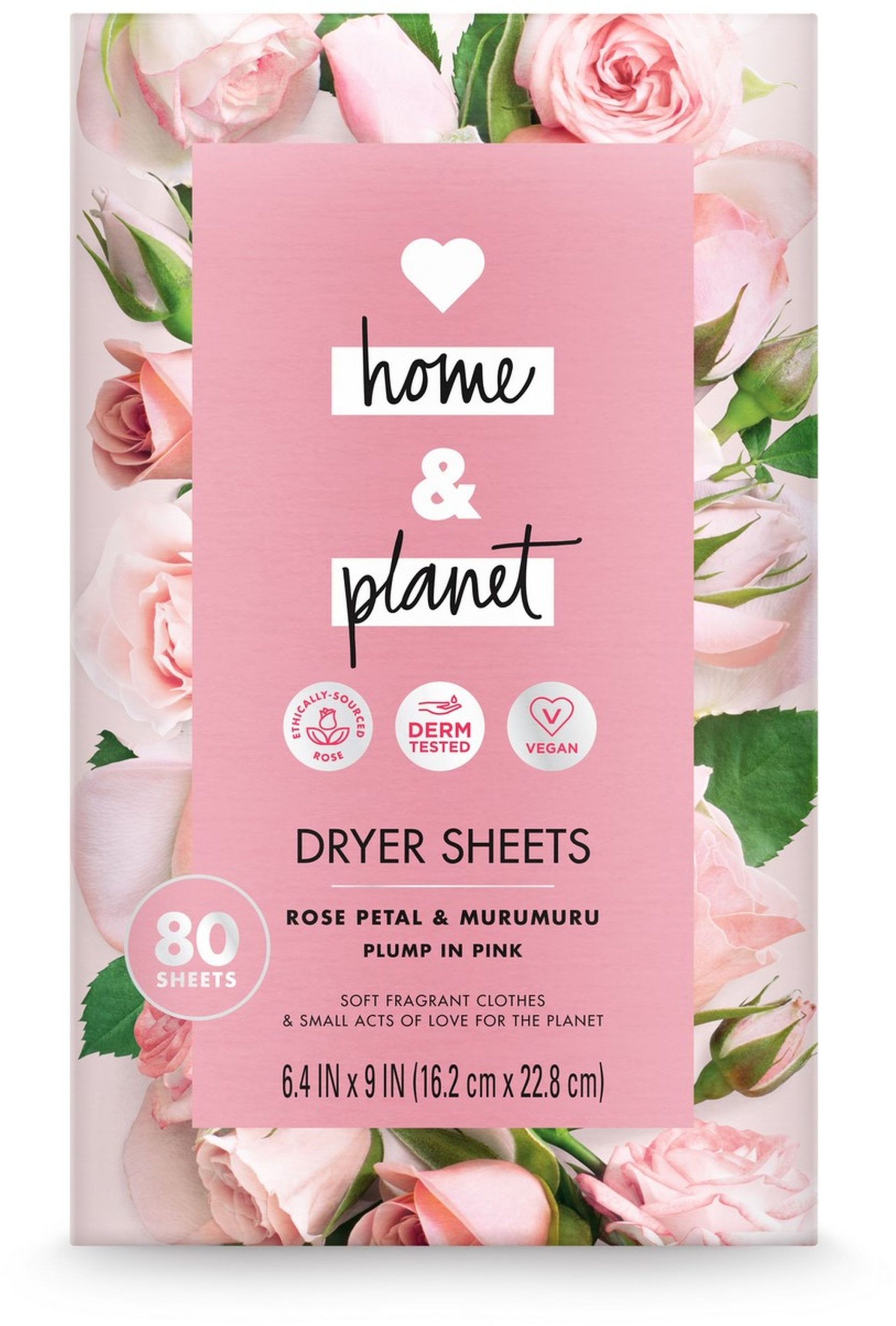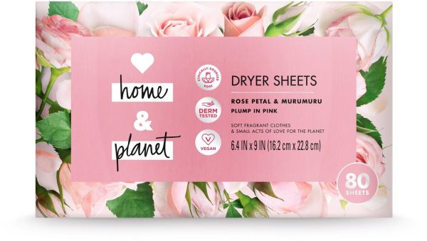 There are some great crunchy things in the world (ah, granola), but crunchy clothes are not one of them. These dryer sheets are infused with notes of ethically sourced Bulgarian Rose absolute and blended with sumptuous Amazonian Murumuru, leaving your fabrics with a delicate kiss of nature that lasts.We’ve started our journey towards more eco-friendly cleaning products by loading our products with ingredients that come from renewable sources and packing them in recycled and recyclable bottles. Our goal is a carbon footprint so small, it’s like we weren’t even here. So every time you choose Love Home and Planet, you join our mission for a cleaner planet: We support environmental change-makers. Our voluntary carbon tax supports recycling initiatives. HOW TO USE: Use a single sheet with each load and place it on top of wet clothes. Don’t forget to follow the care label instructions on clothing. Not for use with children’s sleepwear or other garments labeled as flame resistant as they reduce flame resistance. 80 sheets.