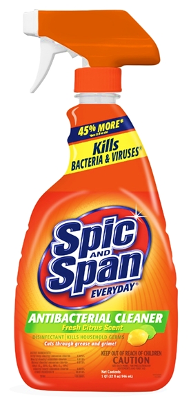 Spic & Span Fresh Citrus Antibacterial Multi-Surface Cleaner is a convenient way to keep surfaces in your kitchen and bathroom looking their best It also protects your family with a special formulation designed to eliminate household germs like Staphylococcus aureus [Staph], Streptococcus pyogenes [Strep], Influenza A/Brazil [influenza] and Escherichia coli [E. Coli]A one-step disinfectant and antibacterial that cleans with a fresh citrus scent! Perfect for use on washable, nonporous surfaces such as floors, walls, counter tops, sinks, tubs, and the exterior surfaces of appliances. Cuts through grease and grime, Fights Mold and Mildew TO CLEAN AND DEODORIZE: Apply undiluted to surfaces with a cloth, mop, sponge or spray. Wipe or allow to air dry DISINFECTION/*VIRUCIDAL/FUNGICIDAL/MOLD MILDEW CONTROL DIRECTIONS: Spray 6 8 inches from surface, until surfaces are thoroughly wet. Do not breathe spray. Treated surfaces must remain wet for 10 minutes. Note to reviewer: For Influenza Virus Type A] treated surfaces must remain wet for 1 minute. Wipe dry with a clean cloth, sponge, or mop or allow to air dry. For heavily soiled areas, a preliminary cleaning is recommended And Span Everyday Fresh Citrus Scent Antibacterial Spray Cleaner 32 Oz. Each Bottle (Pack of 1) (Packaging May Vary). Spic and Span Fresh Citrus Antibacterial Multi-Surface Cleaner is a convenient way to keep surfaces in your kitchen and bathroom looking their best. It also protects your family with a special formulation designed to eliminate household germs like Staphylococcus aureus [Staph], Streptococcus pyogenes [Strep], Influenza A/Brazil [influenza] and Escherichia coli [E. Coli]