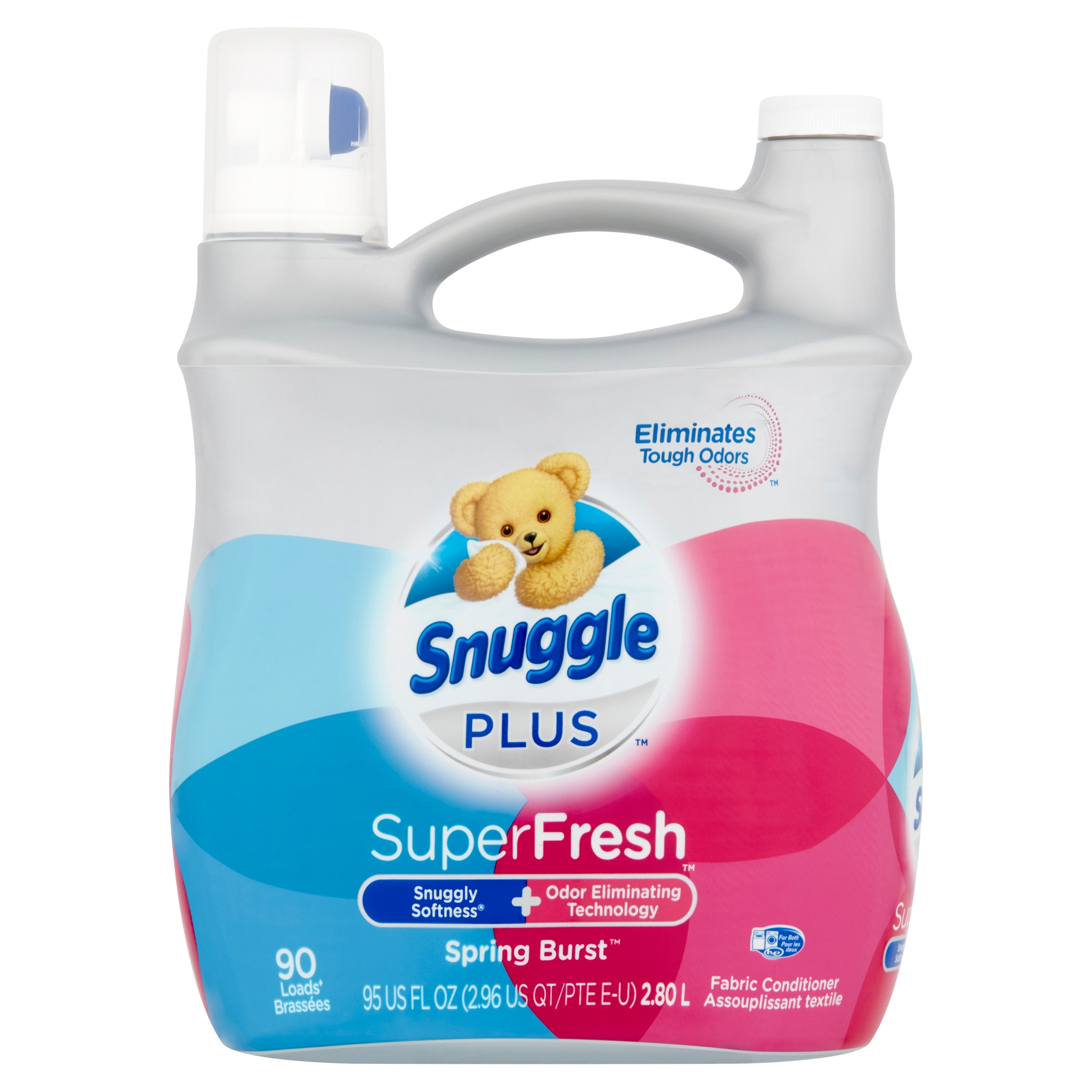 Snuggle Plus SuperFresh liquid fabric softener doesn’t just mask tough odor, it eliminates tough odors and releases Snuggly Freshness. Enjoy the Snuggle benefits you love like Snuggly Softness and long-lasting freshness plus specially formulated technology that attacks tough odors like body, pet, and outdoor odors. Try our odor-fighting regimen use SuperFresh Spring Burst liquid fabric softener and SuperFresh Snuggle Scent Shakes SuperFresh Spring Burst. Includes one 95 oz bottle of Snuggle SuperFresh Spring Burst liquid fabric softener, enough for 90 loads.