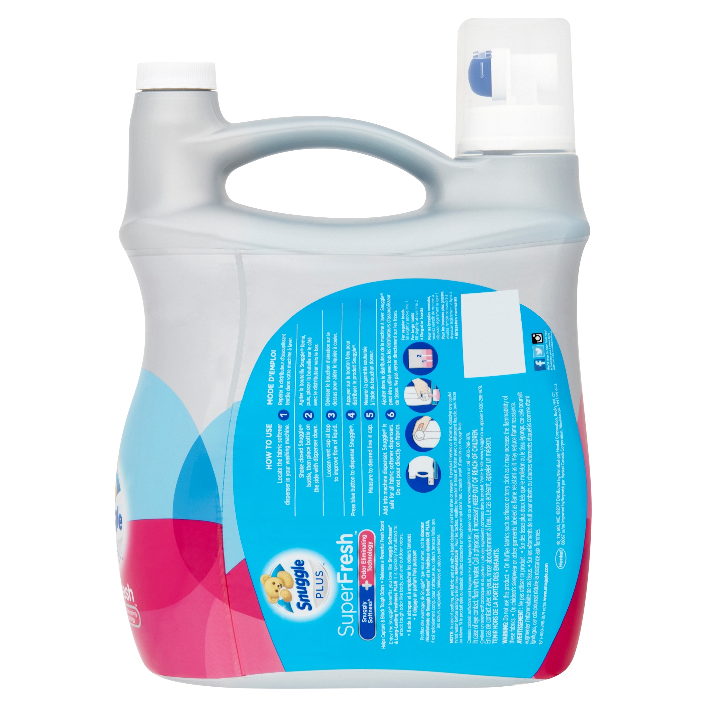 Snuggle Plus SuperFresh features the Snuggly softness you love, plus odor eliminating technology. It doesn’t just mask tough odor, it helps eliminate it and releases Snuggly freshness. Snuggle PLUS SuperFresh is the first-ever fabric conditioner & dryer sheet regimen designed to help eliminate tough odor and keep your favorites fresh. For a top loader washing machine, add Snuggle brand liquid fabric softener during the final rinse cycle or use an automatic dispenser for added convenience. To avoid spotting, do not pour Snuggle directly onto clothes. For a front loader machine, add Snuggle brand liquid fabric softener to the built-in fabric softener tray that is often placed to the right or left of the detergent tray. Safe for standard and HE washing machines. Includes one 48.6 ounce bottle of liquid fabric softener.