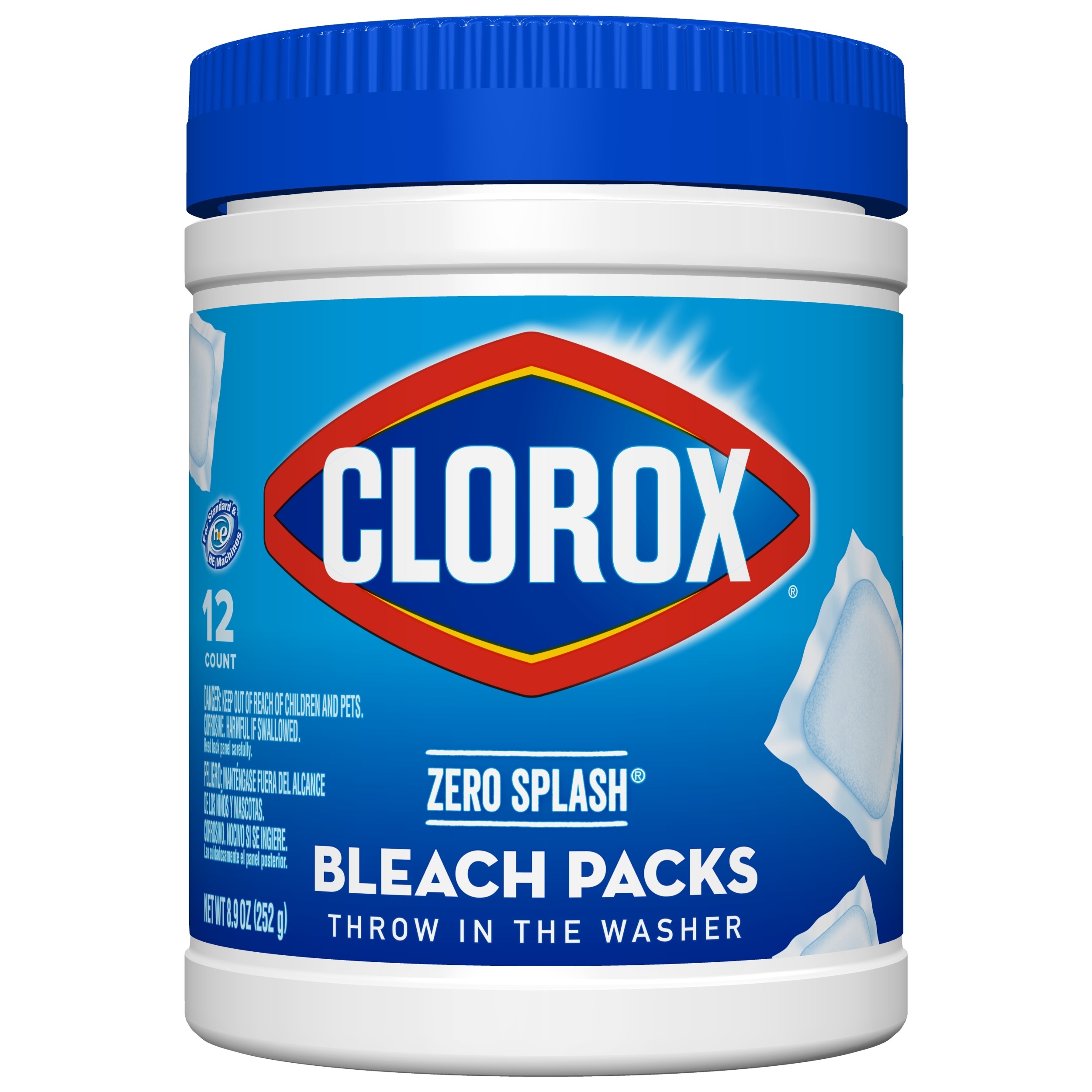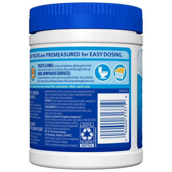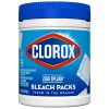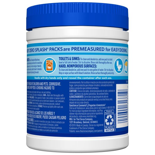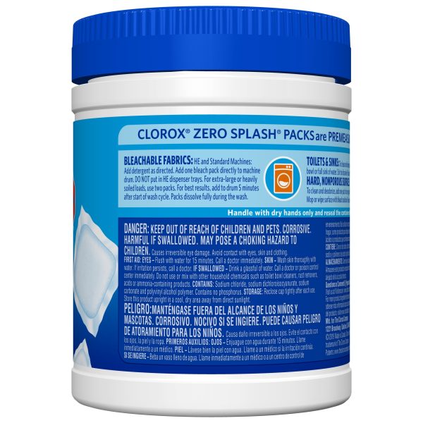 Clorox Zero Splash Bleach Packs bring you the Clorox Bleach clean in a convenient pre-measured solid pack for easy dosing. The solid bleach packs allow you to enjoy whiter laundry and cleaner surfaces without the splash and spills. Clorox Zero Splash Bleach Packs are a convenient solution for cleaning fabrics, toilets, sinks and hard, nonporous surfaces. These specially formulated packs activate upon contact with water for added control. Simply throw a Bleach Pack in the washer drum or drop a pack into a bucket, sink or toilet and stir to dissolve. The packs will dissolve fully in the wash. These compact bleach pods make it easy to grab a pack or two of these and go. No mess, just fresh clean clothes. Clorox Zero Splash Bleach Packs let you clean with the same trusted Clorox power without worrying about bleach spills, splatters or other laundry mishaps.