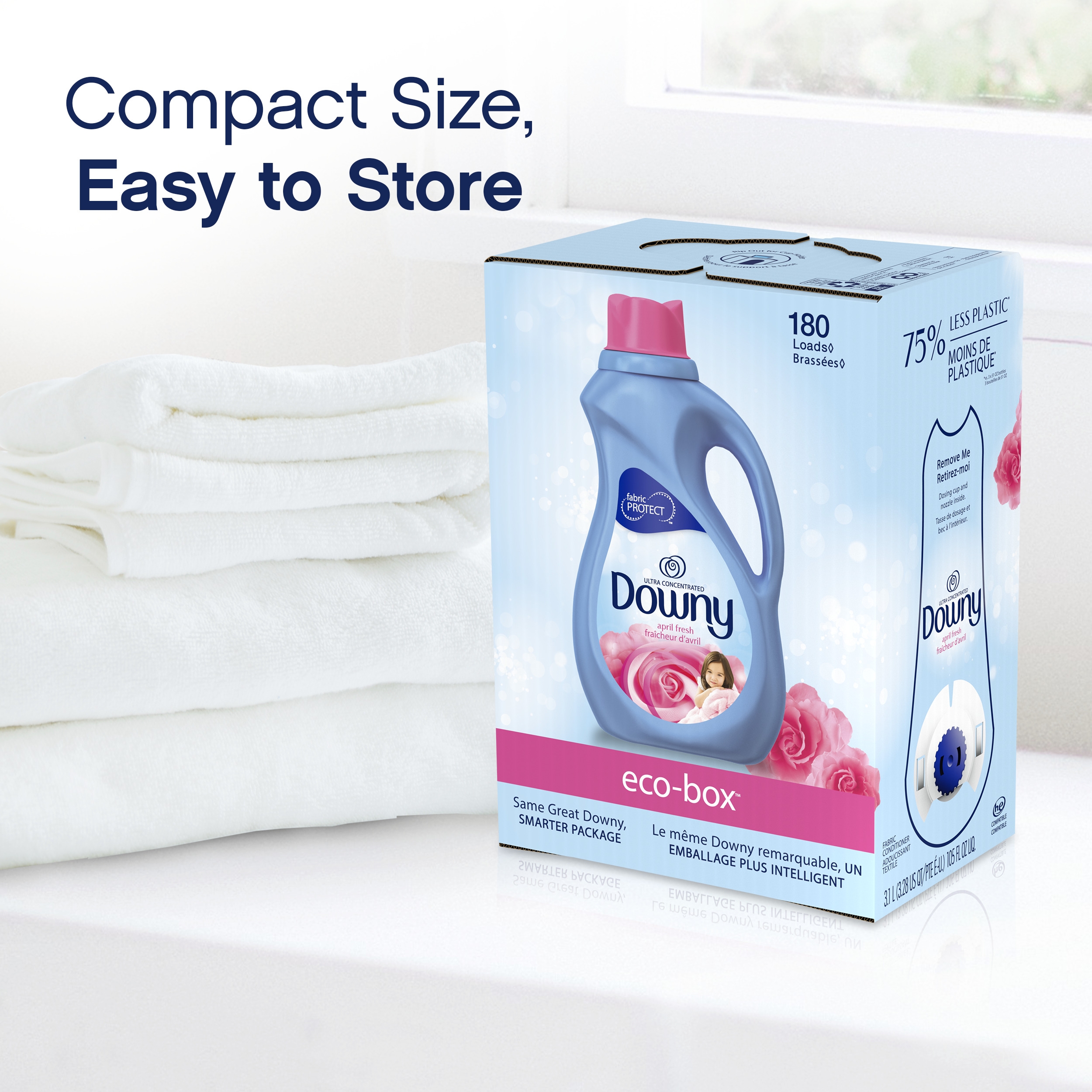 Downy Eco-Box is the same liquid fabric softener that you love, now in smarter package! Made with 30% less water, its re-engineered formula gives you more softening power per drop than Downy Original Liquid Fabric Softener, plus it’s smaller and easier to store. It’s compressed into a shipping-safe package made from 75% less plastic* and features a No-Drip Tap to help minimize any leaks and spills. To assemble the Downy Eco-Box liquid fabric enhancer, simply pull the tab on the side of the pack to reveal the tap and dosing cup. But the best part: It’s easy to use! All you have to do is twist the blue knob counterclockwise to dispense the desired amount of laundry softener into the dosing cup. Make sure to twist slowly so the softener doesn’t come out too quickly. Bring the beautiful bright, floral freshness into your most-loved fabrics with the delightful scent of Downy April Fresh. * Per oz vs. 2 x 51 oz bottles Downy April Fresh Liquid Fabric Conditioner (Fabric Softener) Eco-Box, HE Compatible, 105 fl oz 180 loads
