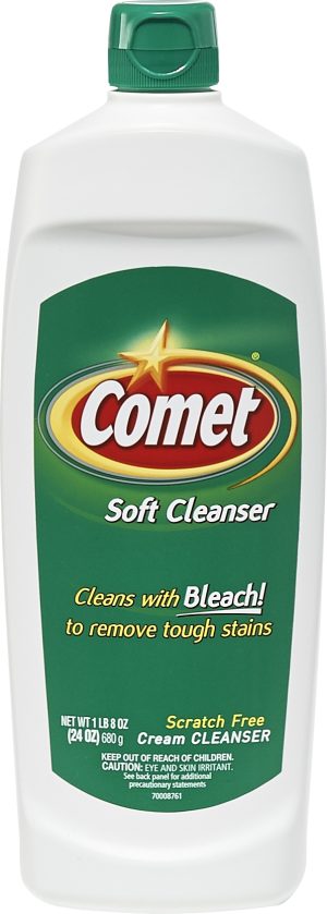 Comet scratch-free soft cleanser cream with bleach combines the tough cleaning power of Comet cleansers to effectively remove grease, tough soap scum, rust stains, mold and mildew. Comet soft cleanser cream is scratch-free, so it is safe to use on most surfaces. New spill proof cap. Contains no phosphate. Convenient 24oz size lasts for weeks of use while fitting well under sinks and storage areas.