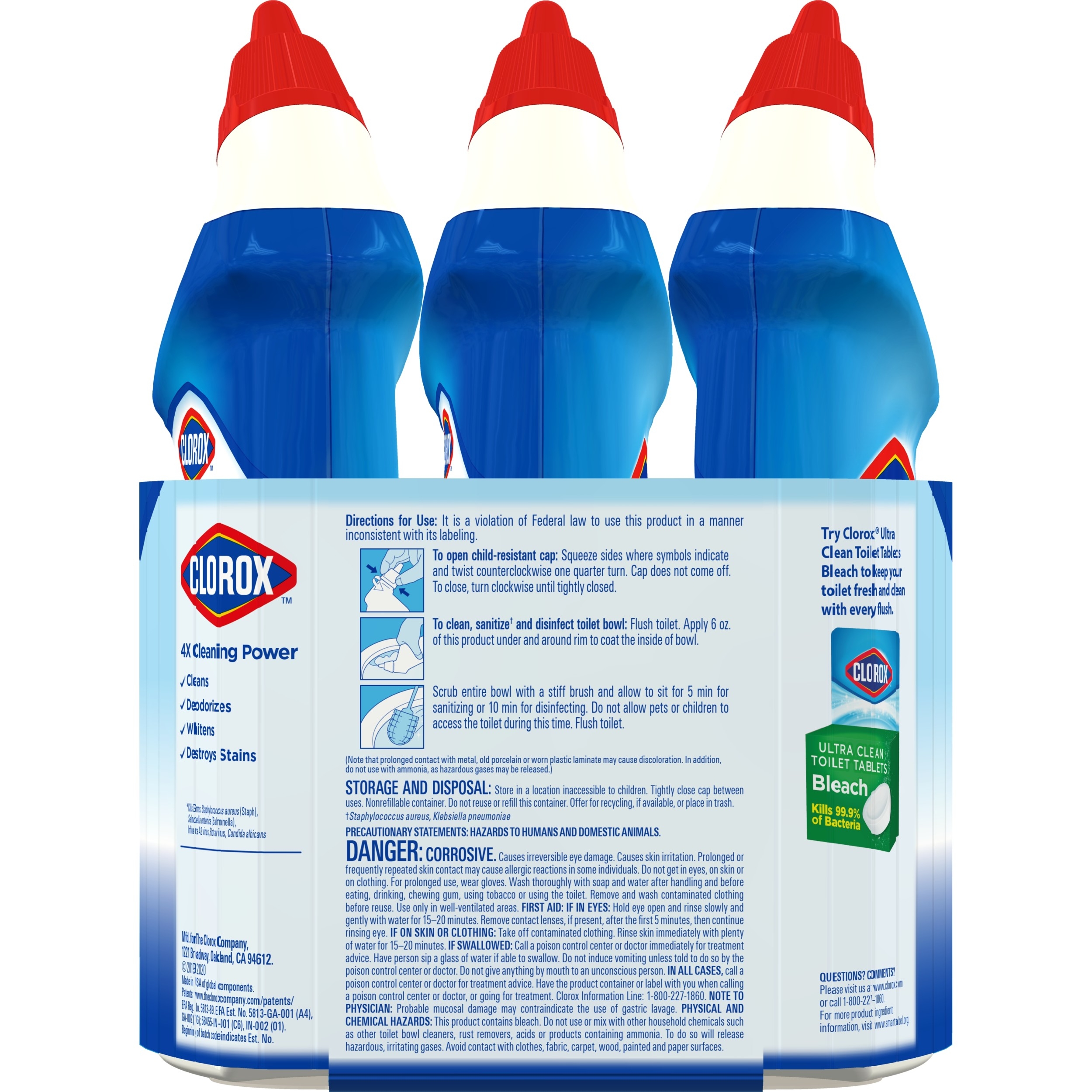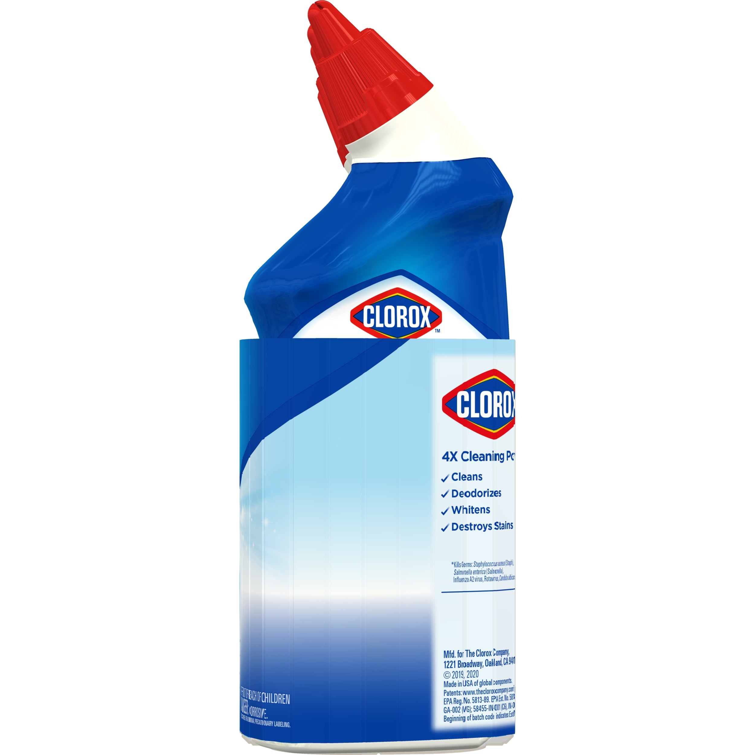 Clorox Toilet Bowl Cleaner with Bleach kills 99.9%, including COVID-19* Virus, of germs and whitens and brightens your toilet bowl with the trusted power of Clorox Bleach. This powerful gel cleaner clings to your toilet bowl while it destroys tough stains, disinfects and eliminates odors with a refreshing Rain Clean Scent. The only toilet bowl cleaner with Clorox Bleach, this thick cleaning gel deep cleans and leaves toilets sparkling and bright. Clorox Toilet Bowl Cleaner with Bleach deodorizes as it whitens and brightens. Uniquely angled, this dispensing nozzle makes it easy to tackle hard-to-reach areas under the bowl rim with a simple squeeze of the bottle. The clinging bleach action lets you power through the toughest toilet stains with confidence. Flush toilet. Apply six ounces under and around the rim. Scrub entire bowl. Let sit for 5 minutes. Flush toilet. Disinfect and get your toilet squeaky clean with Clorox Toilet Bowl Cleaner with Bleach. *Kills SARS-CoV-2 on hard, nonporous surfaces