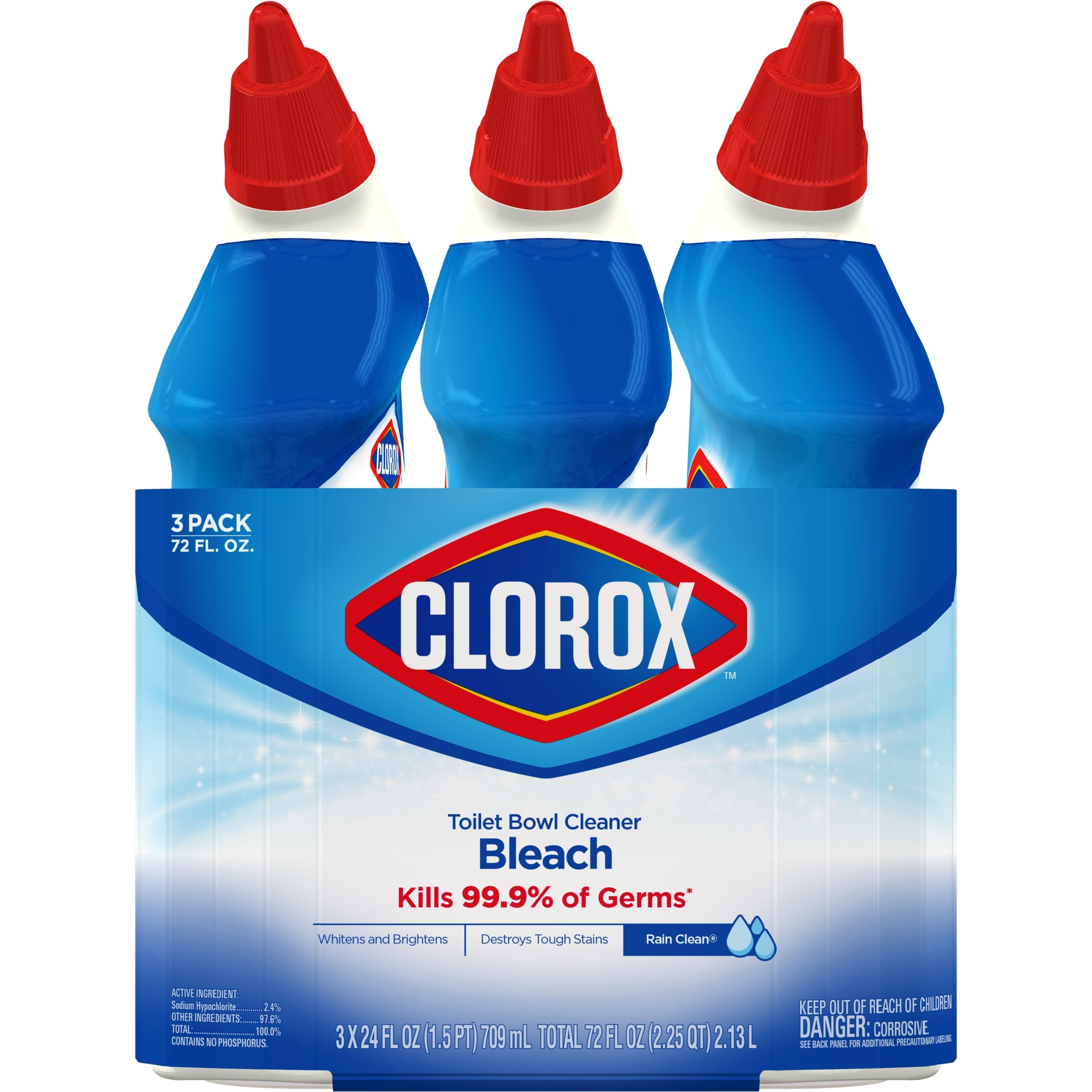 Clorox Toilet Bowl Cleaner with Bleach kills 99.9% of germs and whitens and brightens your toilet bowl with the trusted power of Clorox Bleach. This powerful gel cleaner clings to your toilet bowl while it destroys tough stains, disinfects and eliminates odors with a refreshing Rain Clean Scent. The only toilet bowl cleaner with Clorox Bleach, this thick cleaning gel deep cleans and leaves toilets sparkling and bright. Clorox Toilet Bowl Cleaner with Bleach deodorizes as it whitens and brightens. Uniquely angled, this dispensing nozzle makes it easy to tackle hard-to-reach areas under the bowl rim with a simple squeeze of the bottle. The clinging bleach action lets you power through the toughest toilet stains with confidence. Flush toilet. Apply six ounces under and around the rim. Scrub entire bowl. Let sit for 5 minutes. Flush toilet. Disinfect and get your toilet squeaky clean with Clorox Toilet Bowl Cleaner with Bleach.