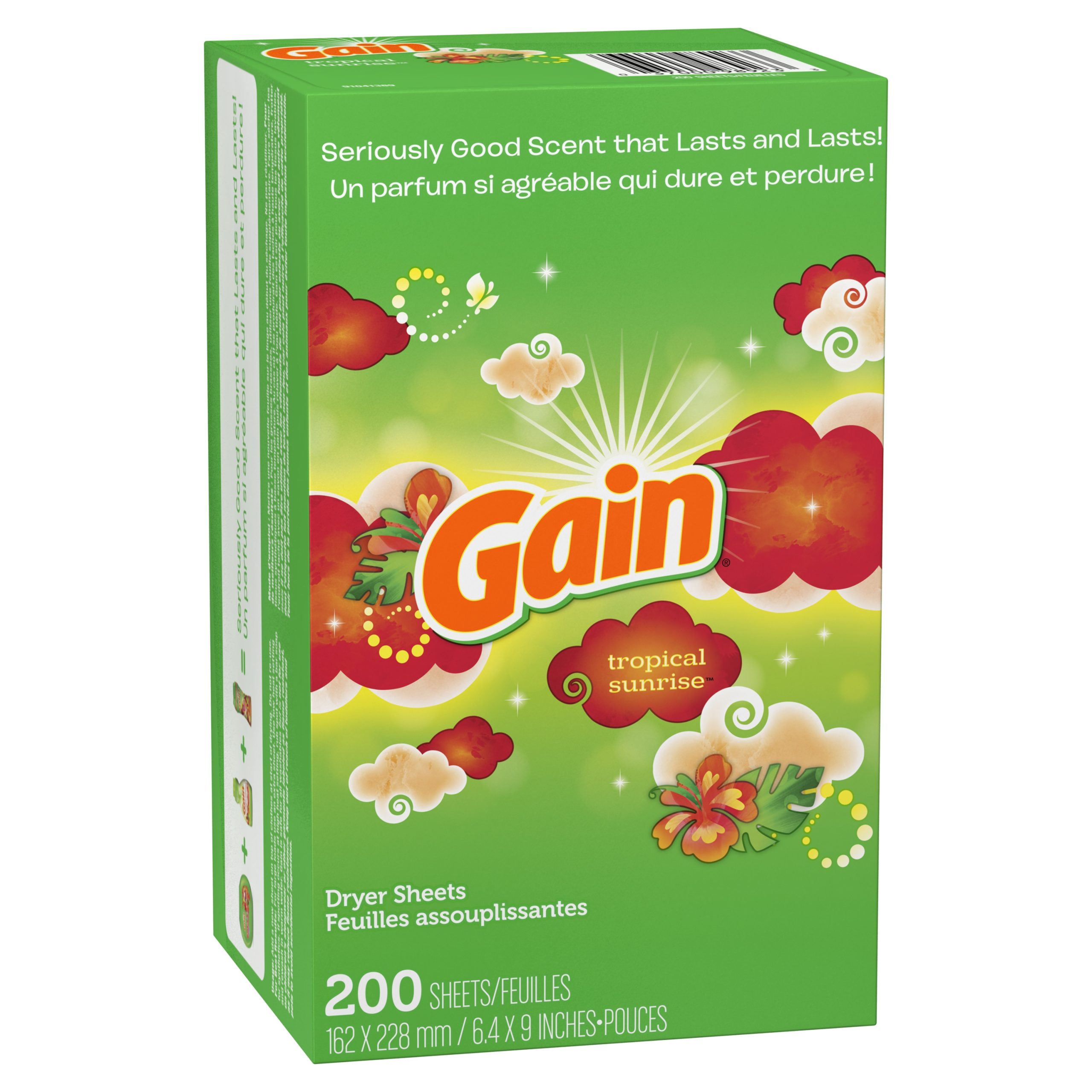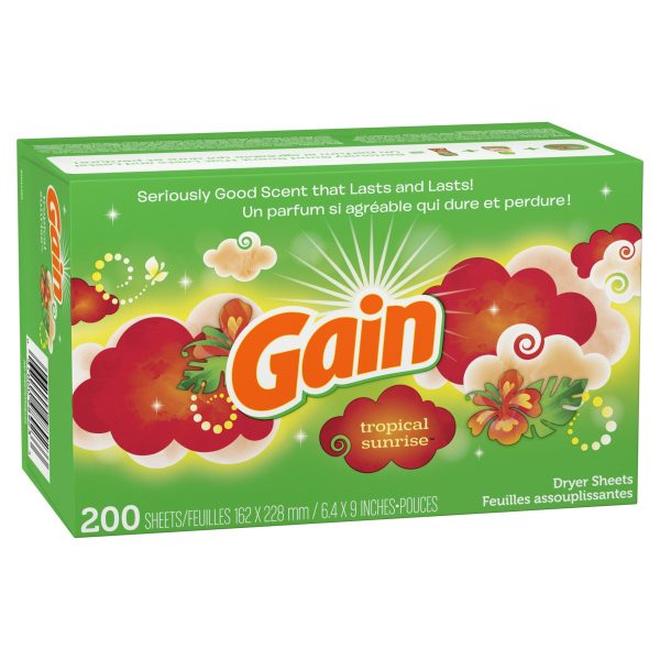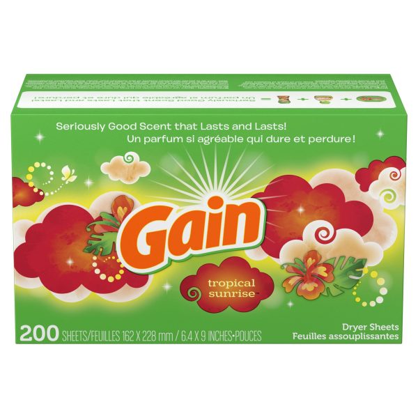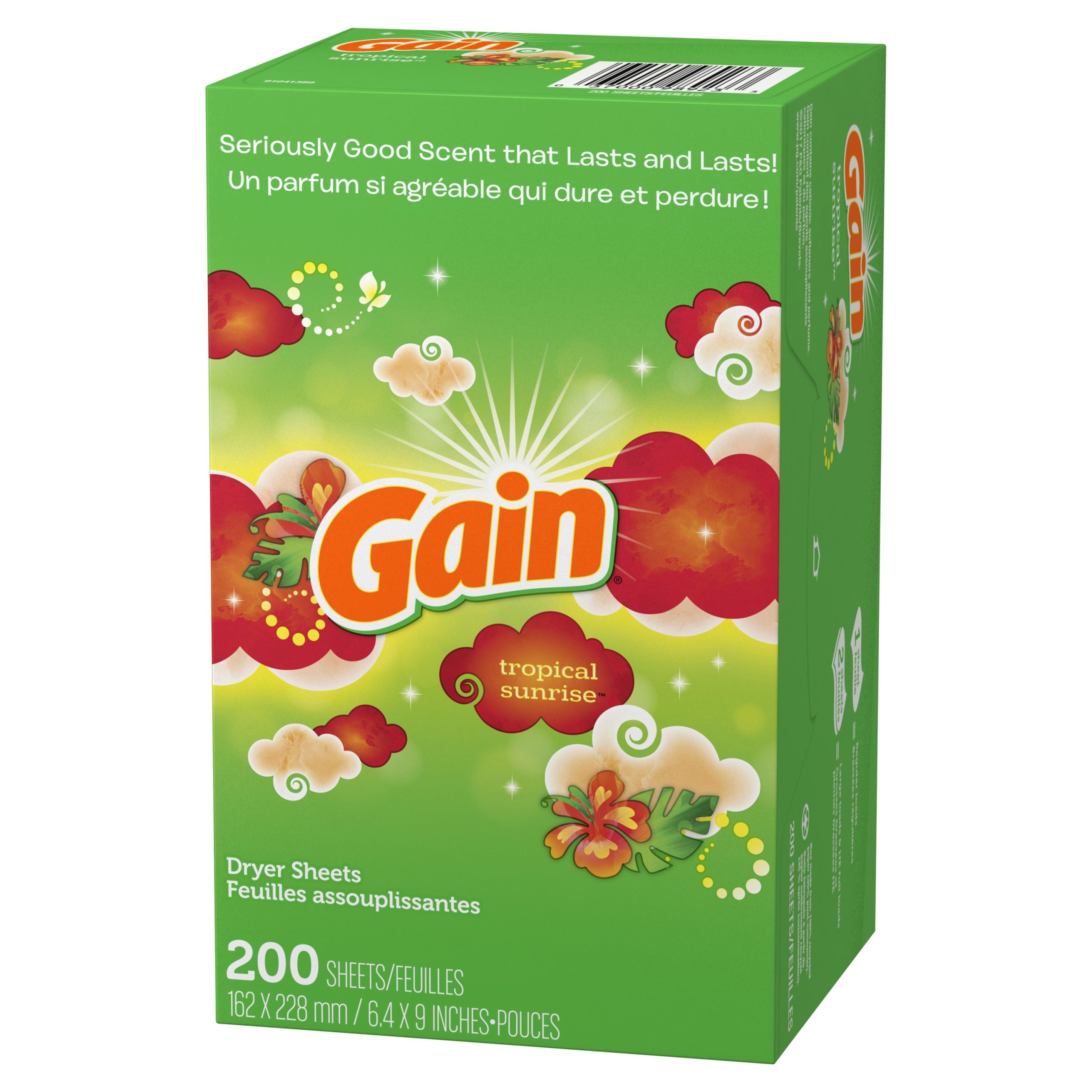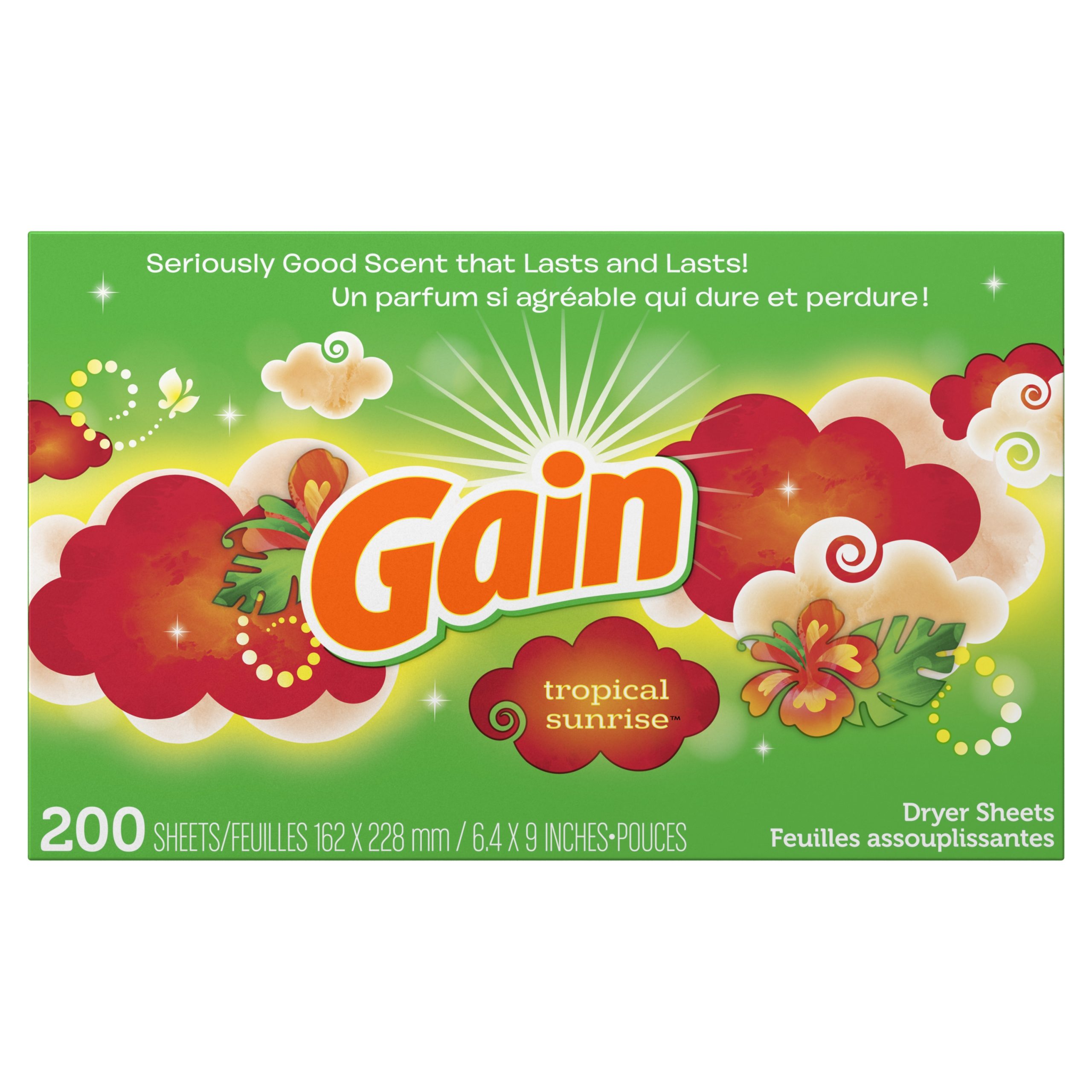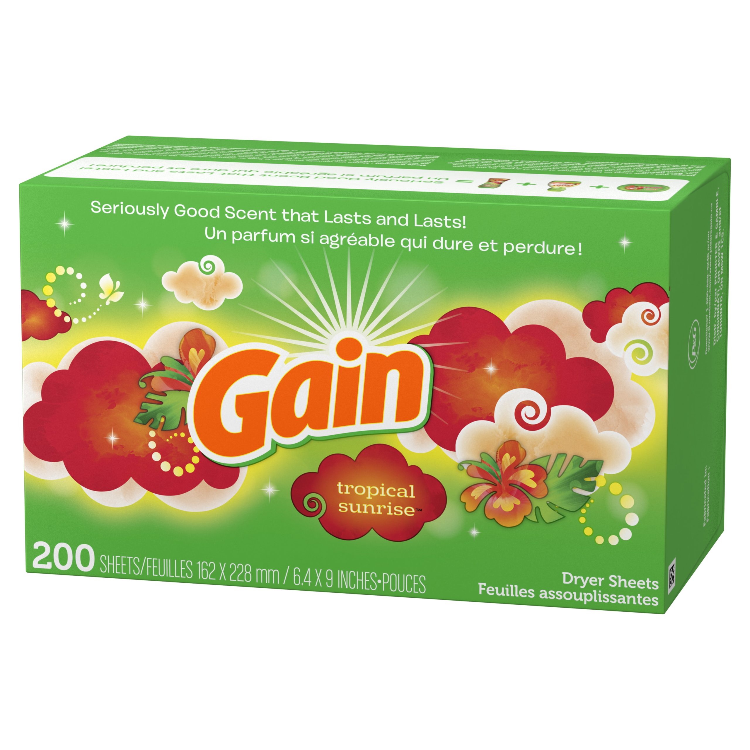 Fluff and tumble your way to fewer wrinkles, more softness and less static cling with Gain Tropical Sunrise Dryer Sheets.