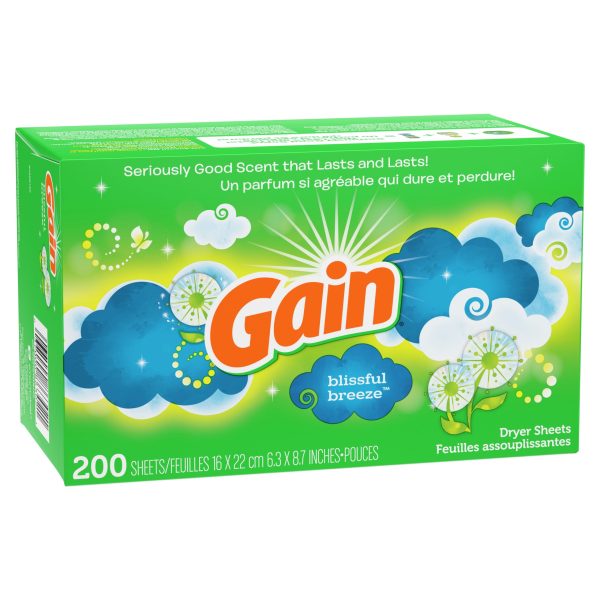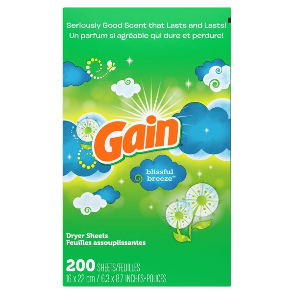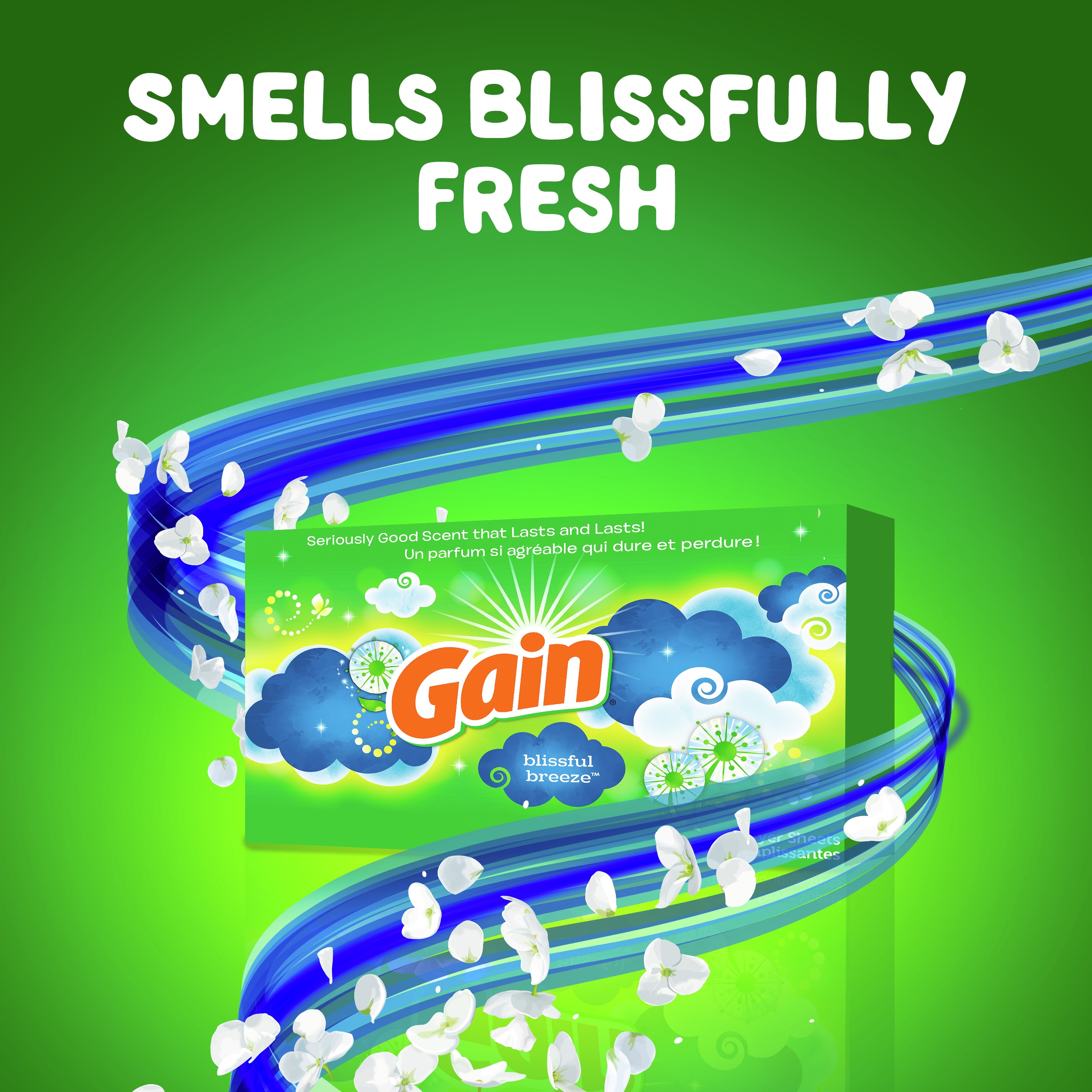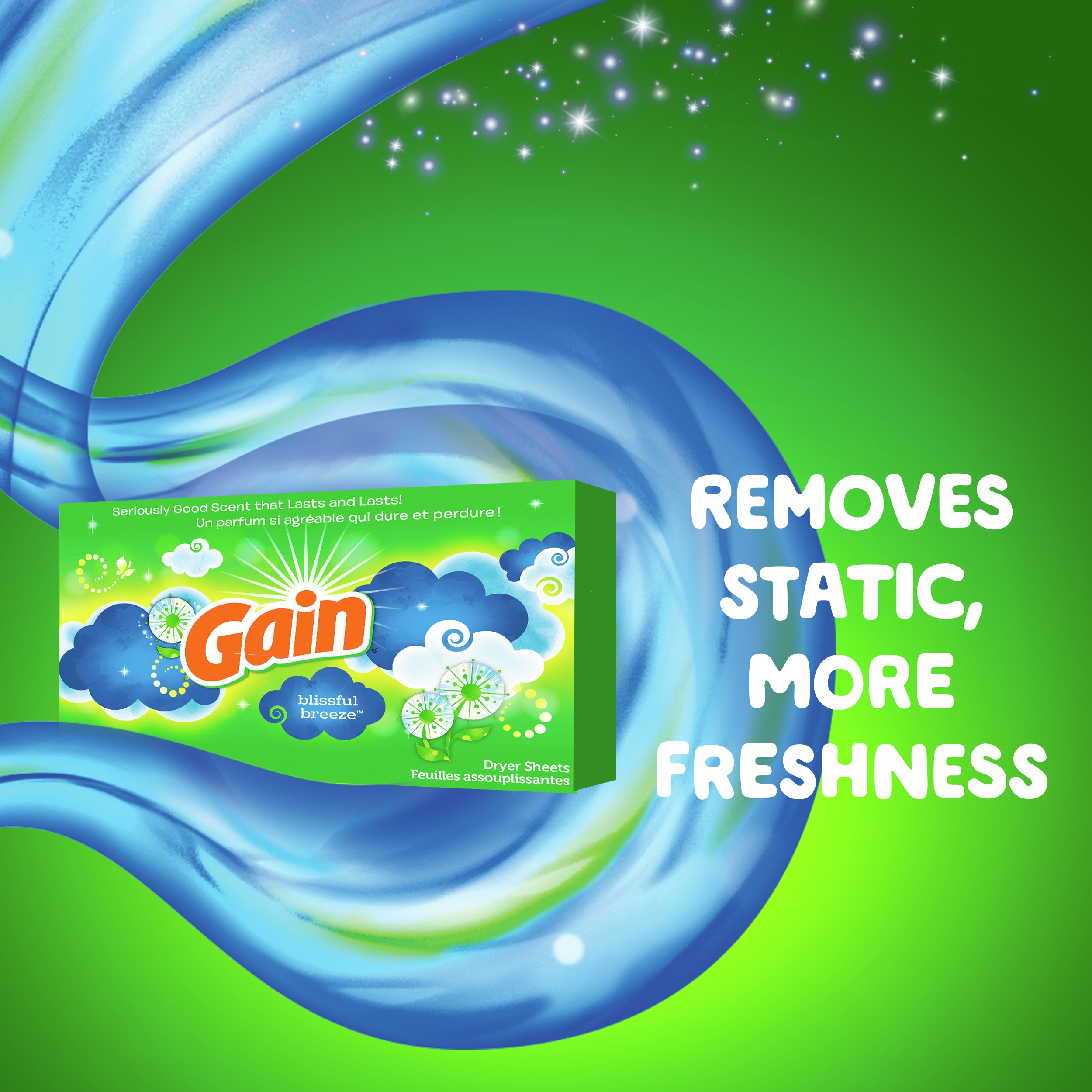 Let the smell of clean linen and fresh air brighten your day with Gain’s lightest and most refreshing scent, Blissful Breeze. Say see ya to static, hello there to softness, and walk out the door smelling like a breath of fresh air. You’ll be gone with the wind with this fresh smelling scent! Pure bliss. Gain Dryer Sheets Blissful Breeze are the perfect complement to other products in our Blissful Breeze line, to keep your clothes so fresh and so clean.
