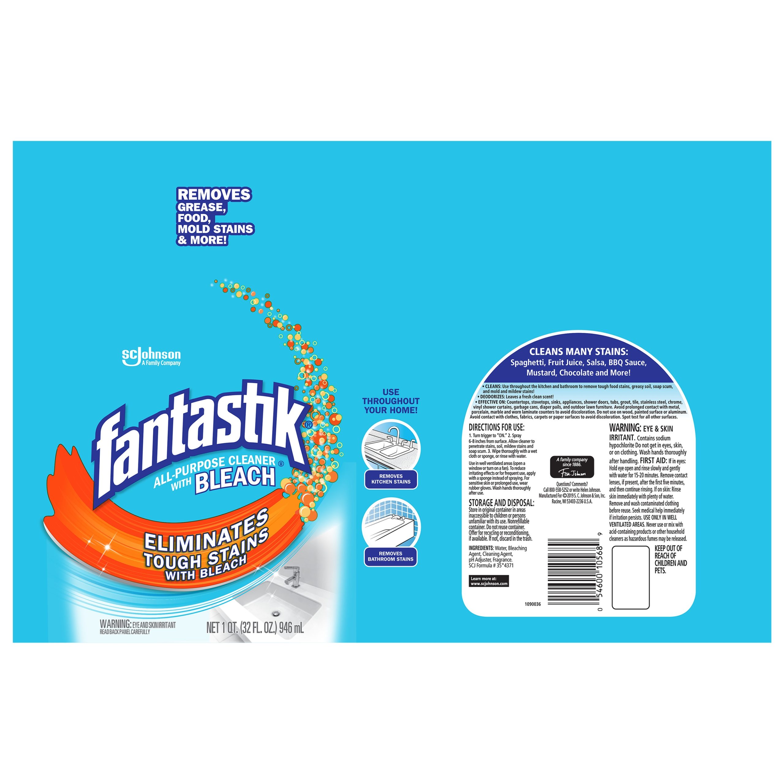 Even the toughest stains are no match for Fantastik All-Purpose Cleaner with Bleach. Use throughout the kitchen and around the house on hard surfaces to remove tough food stains, greasy soil, soap scum, and mold and mildew stains while leaving behind no smeary residue. It’s the perfect solution for countertops, stovetops, sinks, appliances, shower doors, tubs, grout, tile, stainless steel, chrome, vinyl shower curtains, garbage cans, diaper pails, and outdoor lawn furniture. Spend less time cleaning and more time living with Fantastik All-Purpose Cleaners.