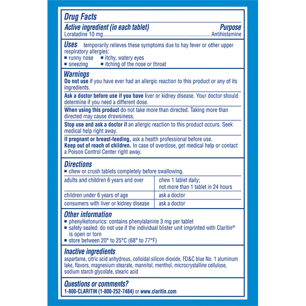Claritin Loratadine, Non-Drowsy, 10 mg, Cool Mint Flavored, Chewable Tablets