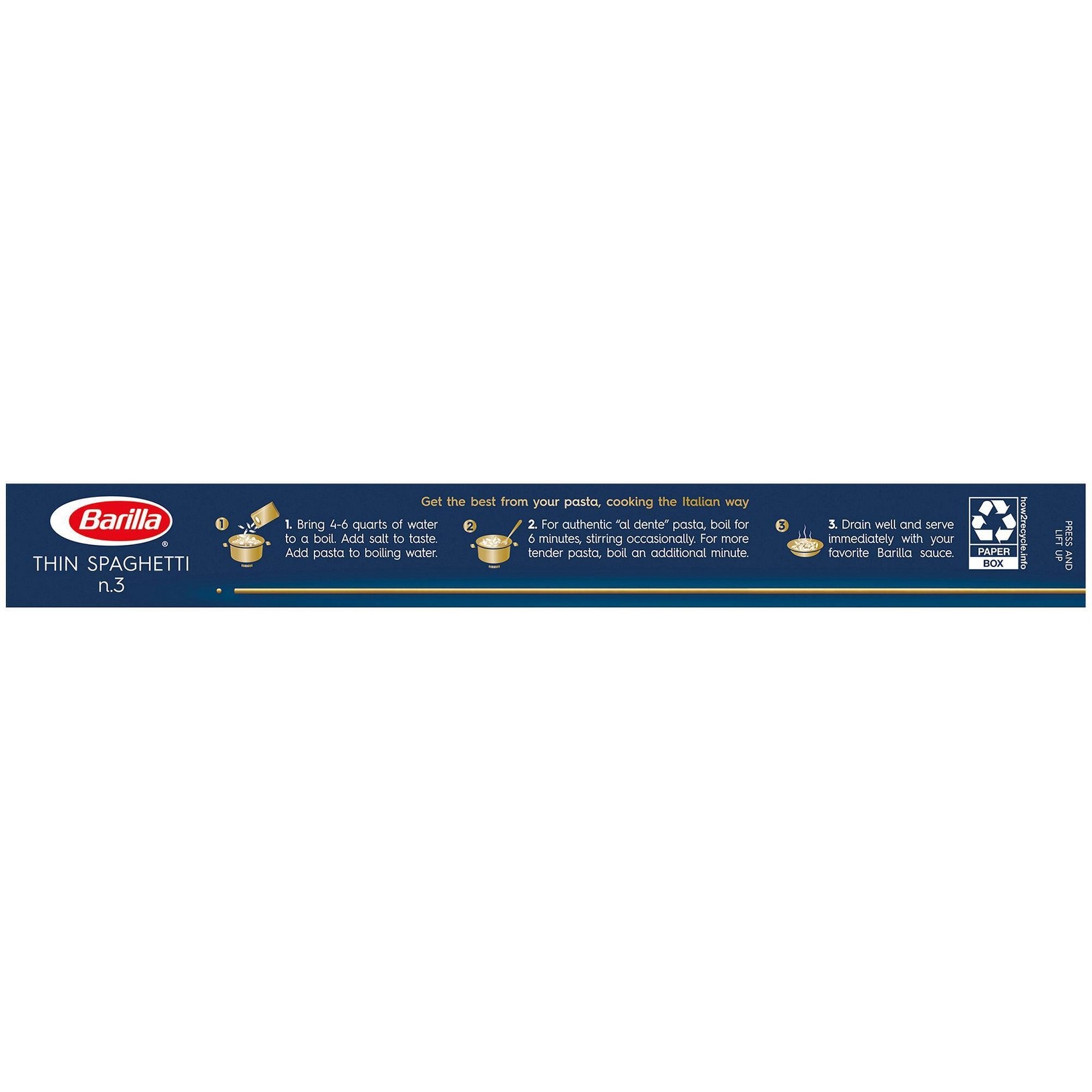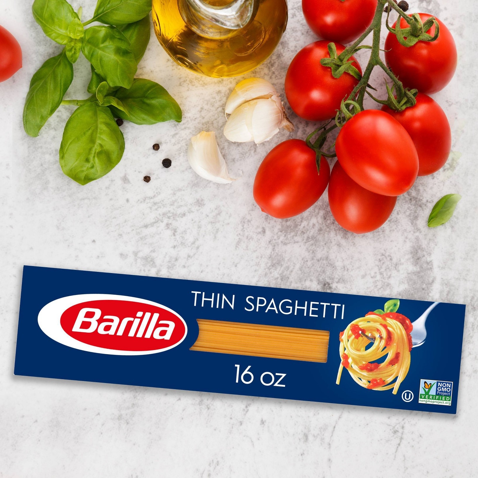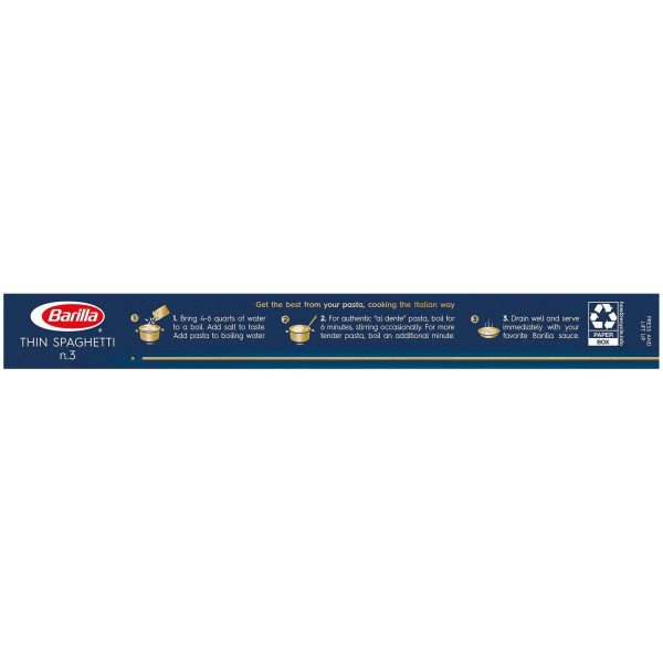 u0026bull;THIN SPAGHETTI PASTA: BARILLA Thin Spaghetti pasta is a everything you love about traditional spaghetti but in a thinner version. This pasta is slightly thicker than angel hair, but still refined and delicateu003cbru003eu0026bull;BARILLA PASTA: Long, golden strands of pasta made with 100% durum wheat and water to deliver great taste and “al dente” texture every timeu003cbru003eu0026bull;CREATE DELICIOUS PASTA MEALS: This thin pasta pairs well with light pasta sauces, like a simple tomato sauce, broth, consommé, or soup, or in a light dairy sauce like parsley crèmeu003cbru003eu0026bull;QUICK AND EASY TO COOK PASTA: “Al dente” perfection in 6-7 minutesu003cbru003eu0026bull;FREE FROM MAJOR ALLERGENS: This pasta is lactose, peanut, shell fish, fish, tree nut, and soy free; Suitable for vegetariansu003cbru003eu0026bull;NON-GMO u0026 KOSHER CERTIFIED PASTA: BARILLA Blue Box pasta is crafted with the highest quality Non-GMO durum wheat semolina and is kosher certifiedu003cbru003eu0026bull;BARILLA BLUE BOX PASTA: A pantry staple, people know the classic BARILLA Blue Box stands for quality and a perfectly “al dente” pasta texture every time. That’s why BARILLA pasta has been an Italian favorite for over 140 years