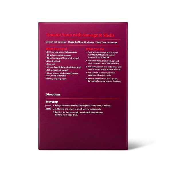 u0026bull;Small shell pasta is perfect for weeknight meals, pasta salad dishes and moreu003cbru003eu0026bull;Small size lends itself to a variety of sauces and ingredientsu003cbru003eu0026bull;No artificial flavors, preservatives or synthetic colorsu003cbru003eu0026bull;Enriched macaroni product