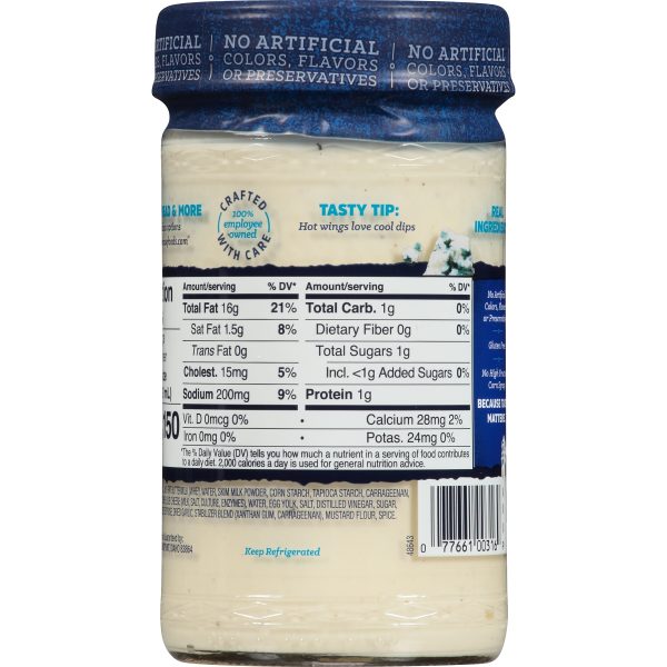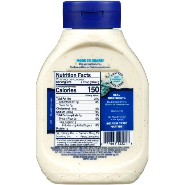 Enhance the flavor of various dishes with Litehouse Chunky Blue Cheese Dressing. It contains a wholesome blend of ingredients including canola oil with Omega-3, artisan blue cheese, buttermilk, homemade mayonnaise and a perfected blend of spices. This gluten-free dressing has 0g of trans fat and no artificial colors, flavors or preservatives added. It’s ideal for pouring over your favorite salads or adding to hamburgers, sandwiches, wings, wraps and even potato salad. It’s available in a convenient 13 fl oz jar.