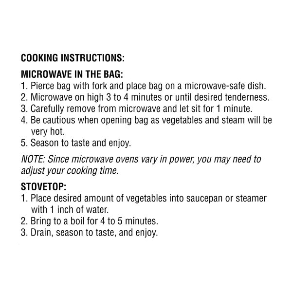 Marketside Vegetable Medley is made with a tasty blend of broccoli florets, baby carrots, and cauliflower florets. These vegetables are picked fresh, washed and ready to eat for your convenience. They taste great on their own and can also be used as an ingredient in casseroles, soups, pot pies, and salads. Serve with beef short rib, roasted carrots, and bread rolls for a hearty classic meal. Season them with all your favorite spices and a hint of melted butter. Follow our delicious roasted vegetable medley recipe located on the back of the packaging. They offer nutritional benefits as they are a rich source of dietary fiber and vitamins A and C. They come packaged inside a microwave-safe bag that heats in as little as three minutes. Healthy sides are made easy with Marketside Vegetable Medley.