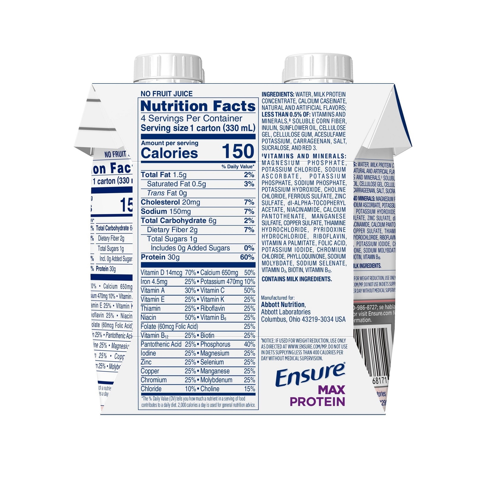 u0026bull;30g HIGH-QUALITY PROTEIN: Ensure Max Protein has protein to support muscle health with 1g of sugar and 150 caloriesu003cbru003eu0026bull;NUTRIENTS FOR IMMUNE HEALTH: A good source of zinc, vitamin A, and antioxidants?vitamins C and Eu003cbru003eu0026bull;NEW FLAVORS: Enjoy new Creamy Strawberry u0026 Milk Chocolate with Caffeine?with 100mg of caffeine, as much as a cup of coffee*u003cbru003eu0026bull;#1 DOCTOR-RECOMMENDED: Ensure is the #1 doctor-recommended brand? of nutrition shakesu003cbru003eu0026bull;TARGETED NUTRITION: With 1.5g of fat and 25 essential vitamins u0026 minerals; suitable for lactose intolerance?; gluten-freeu003cbru003eu0026bull;SNAP: Eligible to be purchased with Supplemental Nutrition Assistance Program (SNAP) benefits?