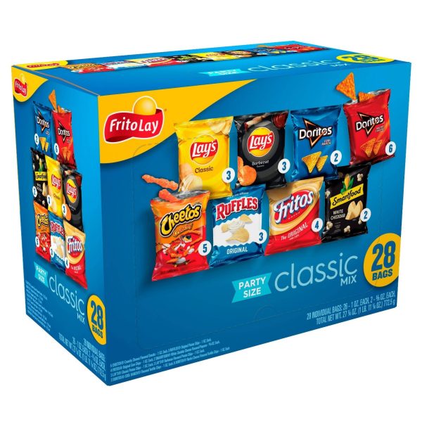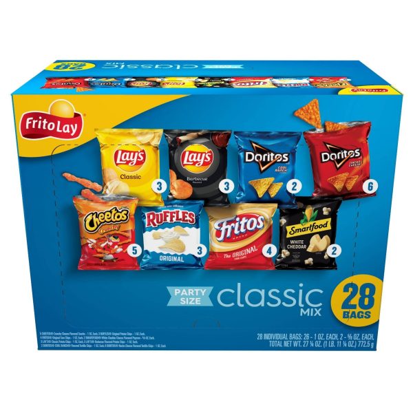 u0026bull; 4 Lay’s Classic Potato Chipsu003cbru003eu0026bull; 5 CHEETOS Crunchyu003cbru003eu0026bull; FRITOS Corn Chips: 3 Bags each of Chili Cheese u0026 Original flavorsu003cbru003eu0026bull; 3 Lay’s Barbecue Potato Chipsu003cbru003eu0026bull; 3 FUNYUNS, u003cbru003eu0026bull; 5 DORITOS Nacho Cheese Tortilla Chips