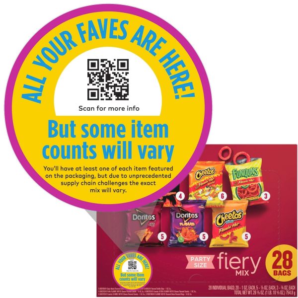 u0026bull;28 count mix includes CHEETOS Crunch Xxtra Flamin’ Hot Cheese Snacks, CHEETOS Crunchy Flamin’ Hot Cheese Snacks, CHEETOS Puffs Flamin’ Hot Cheese Snacks, Doritos Spicy Nacho Tortilla Chips, Doritos Flamas Tortilla Chips and Funyuns Flamin’ Hot Onion Flavored Ringsu003cbru003eu0026bull;You’ll have at least one of each item featured on the packaging, but due to unprecedented supply chain challenges the exact mix will vary.u003cbru003eu0026bull;All your faves are here! But some item counts will varyu003cbru003eu0026bull;Great snacks your whole family will enjoyu003cbru003eu0026bull;Individually packaged for easy on-the-go and flavor-filled snackingu003cbru003eu0026bull;Perfect for packing lunchesu003cbru003eu0026bull;Packaging may vary