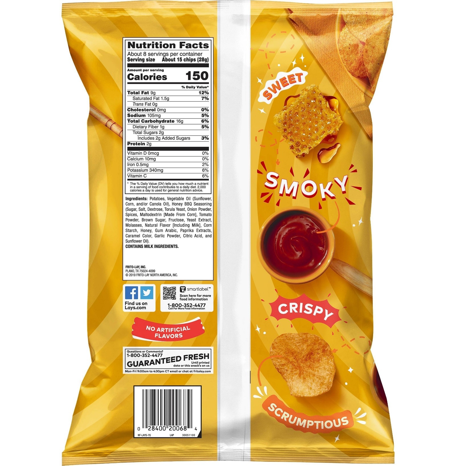 u0026bull;Includes 1 (7.75oz) bag of Lay’s Potato Chips, Honey Barbecue flavoru003cbru003eu0026bull;Sweet taste of honey and the spicy kick of BBQ sauce in every crispy biteu003cbru003eu0026bull;160 Calories per serving, 0 grams of trans fatu003cbru003eu0026bull;Shareable size is perfect to bring some sweet u0026 spicy backyard BBQ flavor to your next party or gatheringu003cbru003eu0026bull;Try packing about 15 chips in your next work or school lunch for just the right amount of smokey BBQ goodness