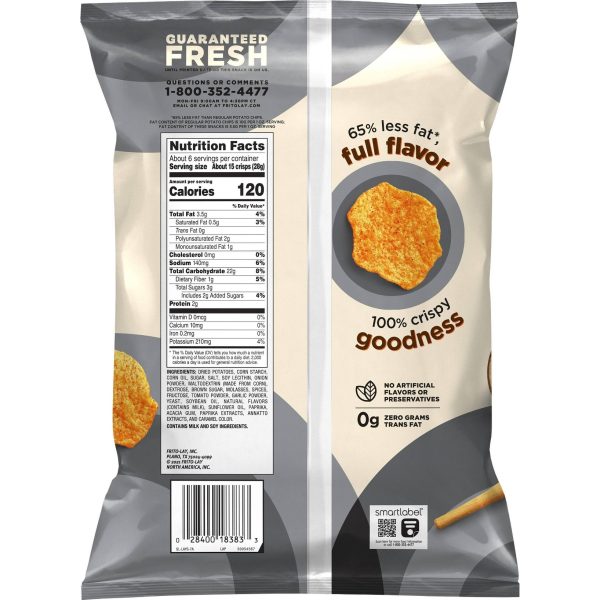 u0026bull;Includes 1 (6.25oz) bag of Lay’s Oven Baked Potato Chips, Original flavoru003cbru003eu0026bull;Oven baked potato chips made with real potatoes and sprinkled with just the right amount of sea salt, all with 65% less fat per serving than classic Lay’s potato chipsu003cbru003eu0026bull;Satisfy your crispy chip craving without the fatu003cbru003eu0026bull;Made with 120 calories per serving and contain 0g of trans fat, and no artificial flavors or preservativesu003cbru003eu0026bull;Try packing about 17 chips in your next work or school lunch for just the right amount of smoky, tangy BBQ flavor