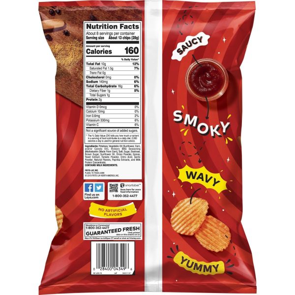 u0026bull;Includes 1 (7.75oz) bag of Lay’s Wavy Potato Chips, Hickory BBQ flavoru003cbru003eu0026bull;Mouthwatering aroma of hickory balanced with the sweet Lay’s BBQ flavor in every crispy ridged potato chipu003cbru003eu0026bull;Wavy Lay’s are made with real potatoes and no artificial flavors or preservativesu003cbru003eu0026bull;Try pairing with Lay’s Smooth Ranch or French Onion Dip for a match made in heavenu003cbru003eu0026bull;160 Calories per 13 chip serving, try packing in your next work or school lunch to bring some backyard BBQ flavor to your day