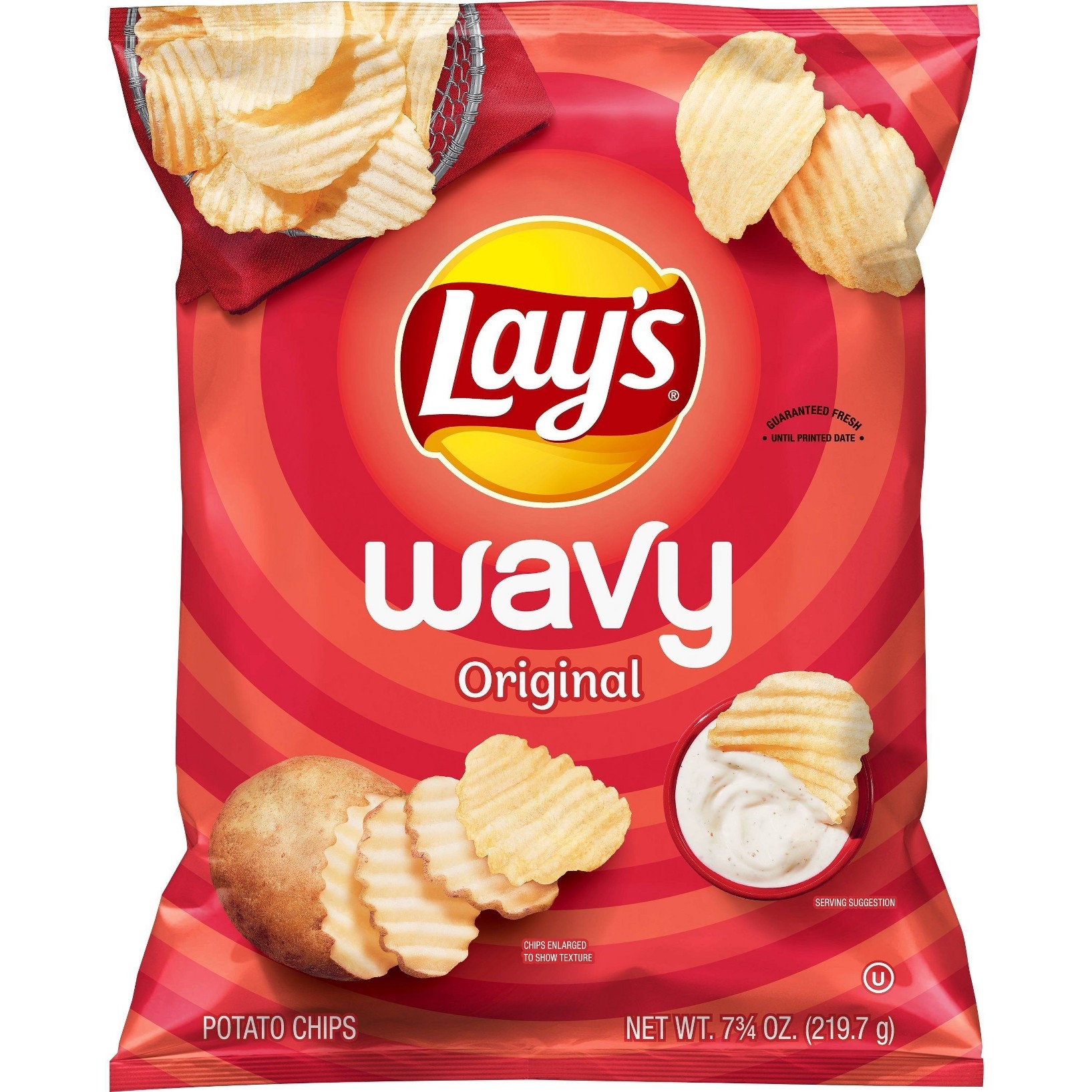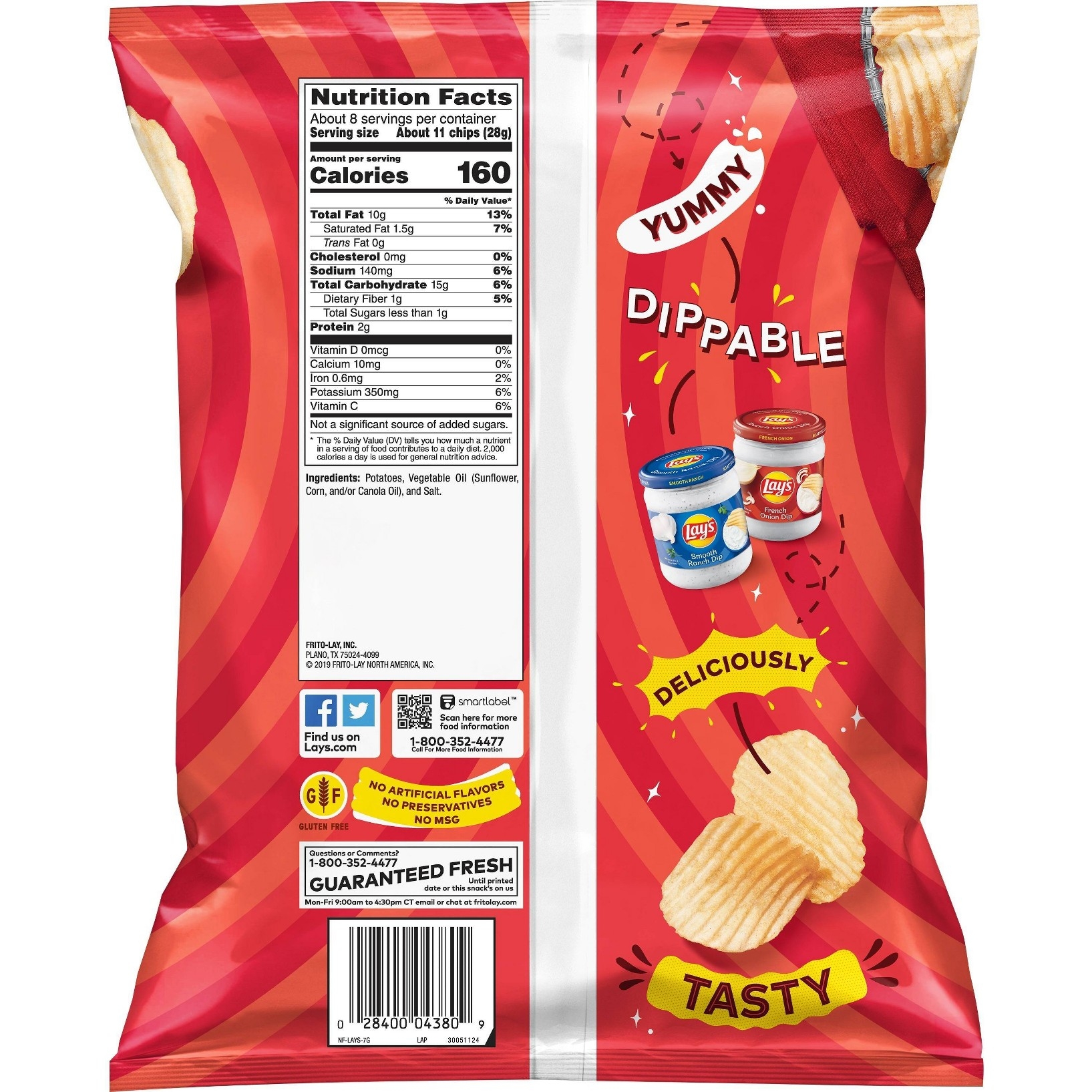 u0026bull;Includes 1 (8oz) bag of Lay’s Wavy Potato Chips, Original flavoru003cbru003eu0026bull;Delicate u0026 crispy ridged chips perfect for dipping and made with only 3 ingredients: potatoes, vegetable oil, and saltu003cbru003eu0026bull;Try pairing with Lay’s Smooth Ranch or French Onion Dip for a match made in heavenu003cbru003eu0026bull;On your next night in, try topping a handful of Lay’s Wavy potato chips with a sprinkle of chocolate chips and microwaving for 20 seconds for an instant sweet u0026 salty treatu003cbru003eu0026bull;160 Calories per 11 chip serving; made with no artificial flavors, preservatives or MSG