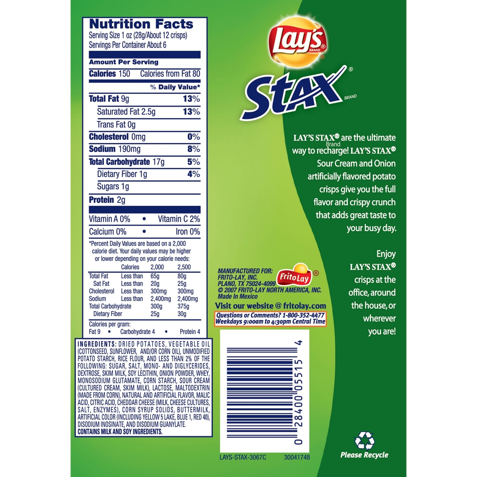 u0026bull; 5.5oz. LAY’S STAX Sour Cream u0026 Onion Flavored Potato Crispsu003cbru003eu0026bull; Delicious sour cream and onion flavor for a lunch snacku003cbru003eu0026bull; Share these crisps with friends and familyu003cbru003eu0026bull; Gluten free