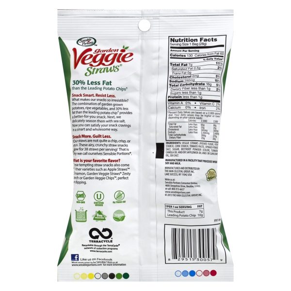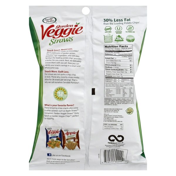 u0026bull;Four 0.75 oz. bags each of Sensible Portions Sea Salt, Zesty Ranch and Cheddar Cheese Veggie Straws u003cbru003eu0026bull;Made with garden-grown potatoes and vegetablesu003cbru003eu0026bull;30% less fat than the leading brand of potato chips* u003cbru003eu0026bull;0mg cholesterol and 0g trans fat per serving u003cbru003eu0026bull;Certified Kosher and gluten-free