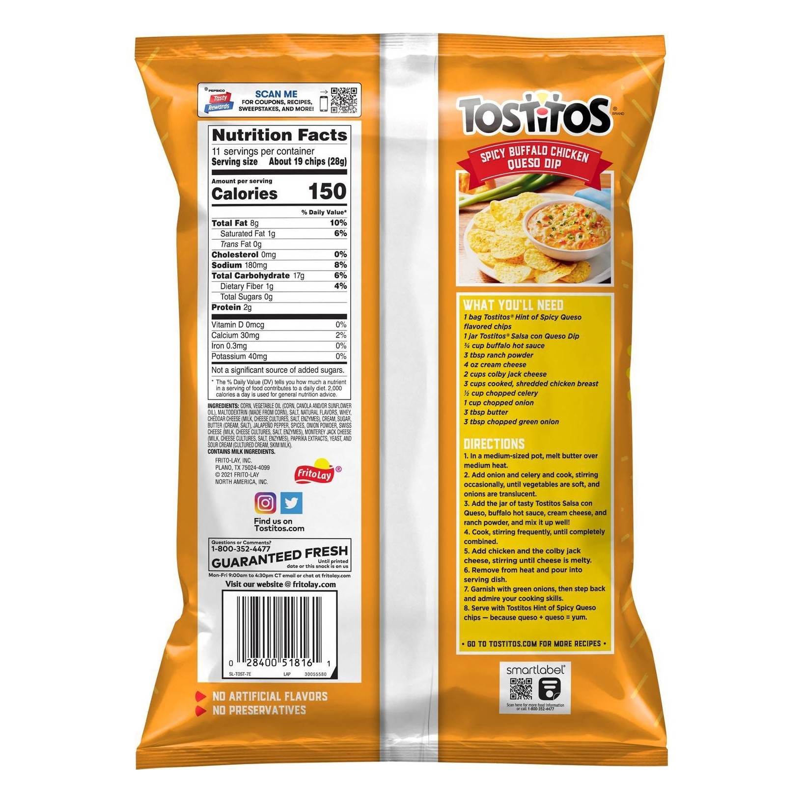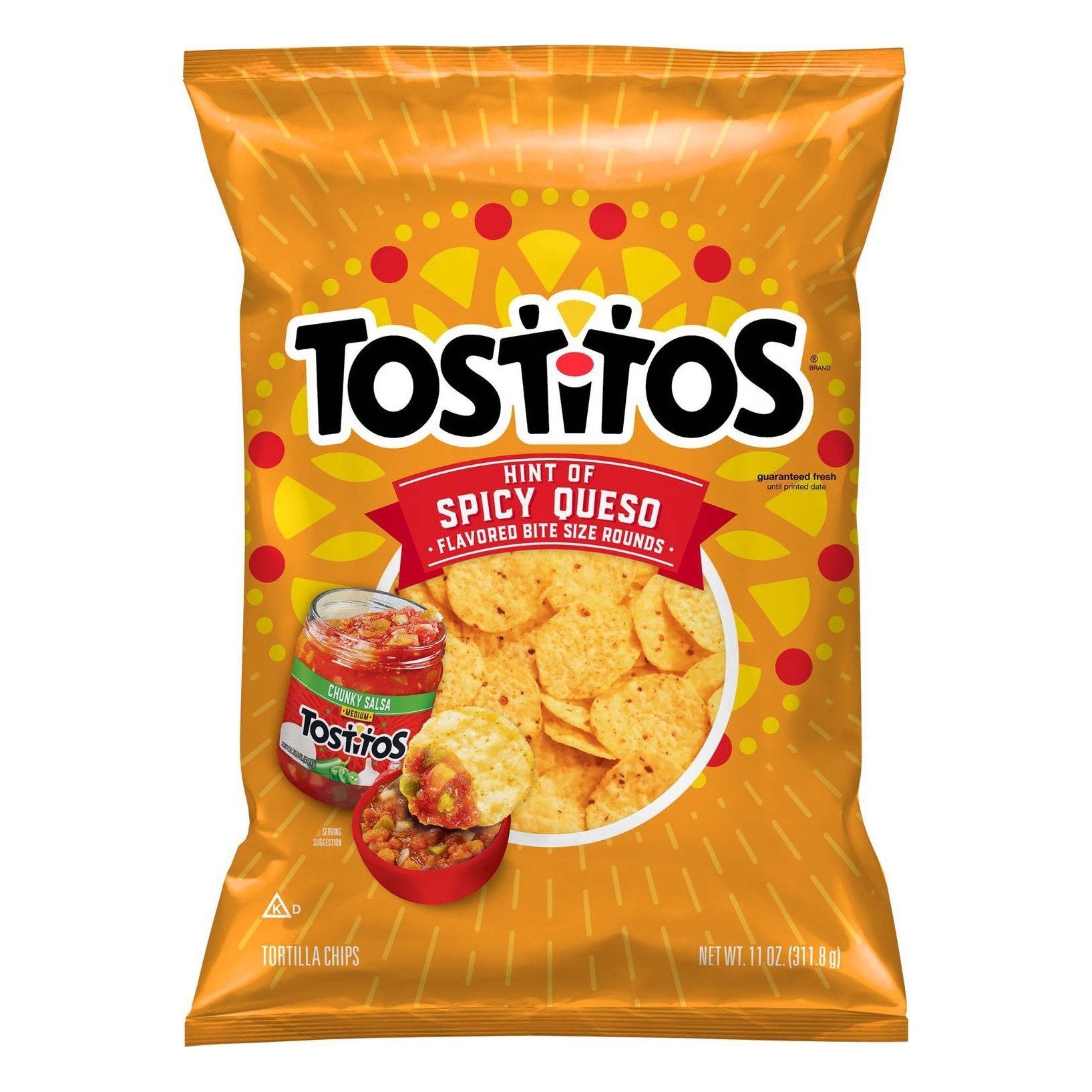 u0026bull;Includes 1 (11oz) bag of Tostitos Hit of Spicy Queso Bite Size Tortilla Chipsu003cbru003eu0026bull;A hint of spicy queso flavoru003cbru003eu0026bull;Pairs perfectly with your favorite Tostitos dipu003cbru003eu0026bull;Fit the contours of a bowl to make sure every last bit of dip is devouredu003cbru003eu0026bull;Completely dippable and totally deliciousu003cbru003eu0026bull;Packaging may vary