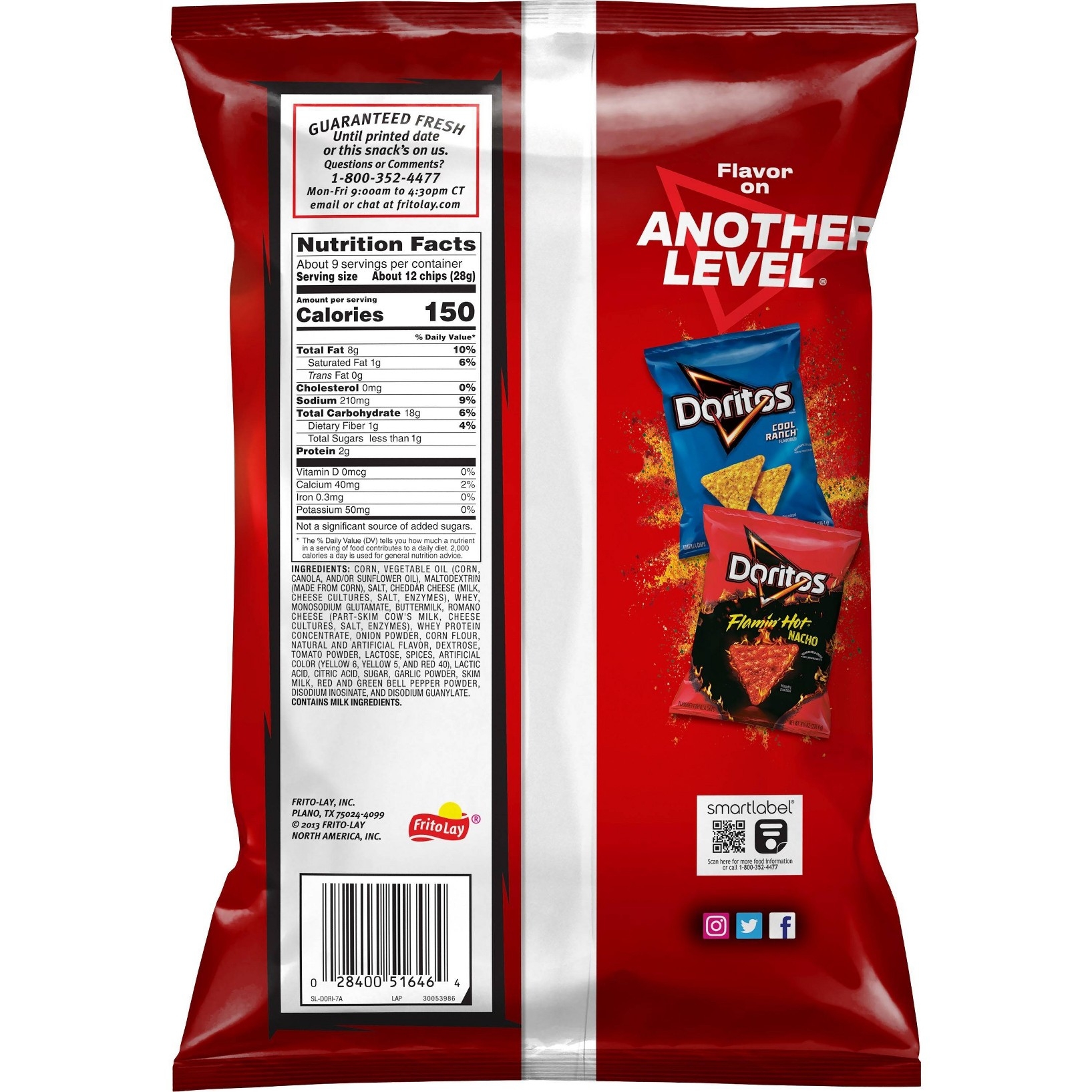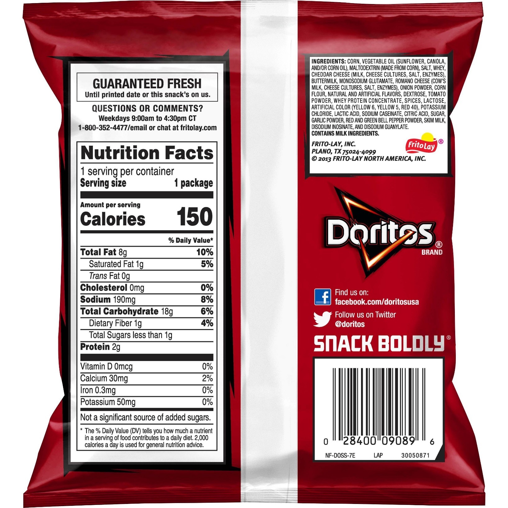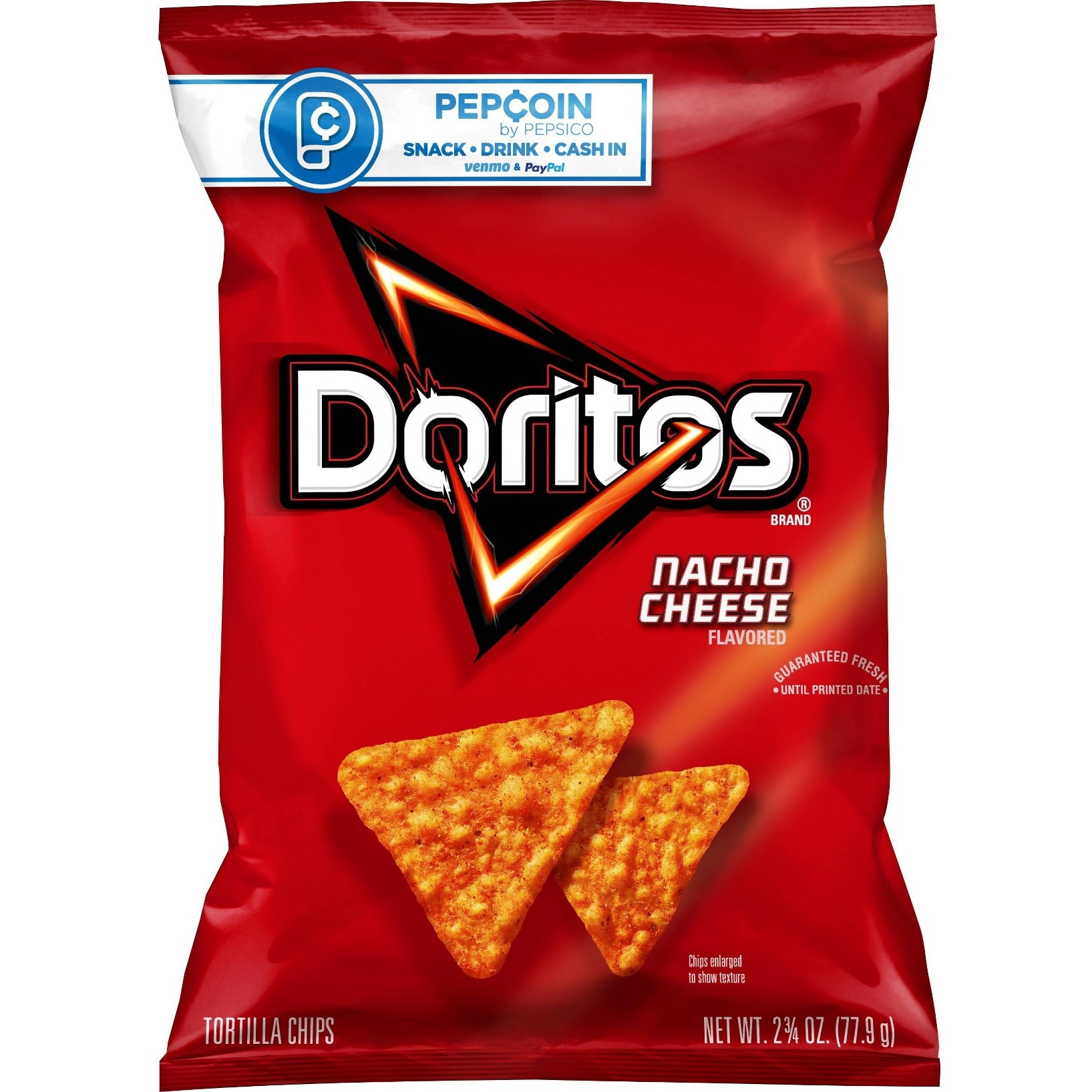 u0026bull;Includes 1 (2.75oz) bag of Doritos Tortilla Chips, Nacho Cheese flavoru003cbru003eu0026bull;Bring a burst of delicious cheesy flavor to your next snack timeu003cbru003eu0026bull;Enjoy the bold snacking experience on its own or try dipping in your favorite salsa or queso dipu003cbru003eu0026bull;Shareable bag is the perfect size to bring some crunchy deliciousness to your next party or gatheringu003cbru003eu0026bull;Try packing about 11 Doritos Nacho Cheese Tortilla Chips to bring just the right amount of cheesy flavor to your next work or school lunch