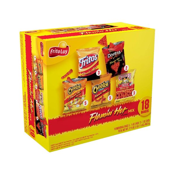 u0026bull;18 count mix includes Flamin’ Hot flavored Frito-Lay snacks, Cheetos Flamin’ Hot Crunchy, Doritos Flamin’ Hot Nacho, Chester’s Flamin’ Hot Fries, Cheetos Flamin’ Hot Puffs, and Fritos Flamin’ Hotu003cbru003eu0026bull;You’ll have at least one of each item featured on the packaging, but due to unprecedented supply chain challenges the exact mix will vary.u003cbru003eu0026bull;All your faves are here! But some item counts will varyu003cbru003eu0026bull;Great snacks your whole family will enjoyu003cbru003eu0026bull;Individually packaged for easy on-the-go and flavor-filled snackingu003cbru003eu0026bull;Perfect for packing lunches