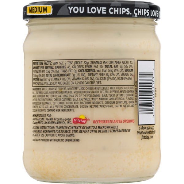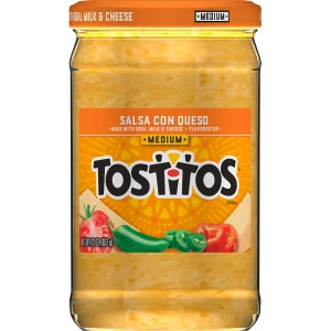 Fire up your taste buds with Tostitos (Medium Salsa Con Queso). It is made with real Monterey Jack cheese. Use Tostitos Salsa Con Queso as a condiment for tacos, nachos and much more. Dip your favorite tortilla or corn chips in it for a tasty snack. With chopped jalapenos and bell peppers, this sauce has a medium heat. It also has a delightfully creamy texture. This salsa contains less than 5mg of cholesterol and no trans fat. Share it with family or friends during a party or while watching a game on TV.