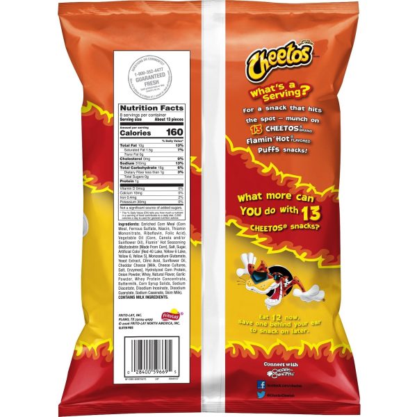 u0026bull;Includes 1 (15oz) bag of Cheetos Flamin’ Hot Crunchy Cheddar Cheese Snacksu003cbru003eu0026bull;Hot, spicy flavor packed into crunchy, irresistible cheese snacksu003cbru003eu0026bull;Made with real cheeseu003cbru003eu0026bull;They’re finger lickin’ good- add some cheesy smiles to your next gathering with this shareable bagu003cbru003eu0026bull;Try packing about 18 cheetos crunchy snacks for your next work or school lunch- that’s just the right amount for fun to the max!