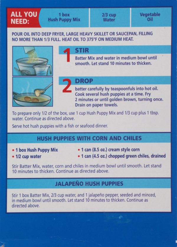 Try this unique blend of yellow corn meal and wheat flour and make tasty hush puppies quickly and easily. Just add water! And enjoy golden fried Hush Puppies that are ready in minutes!