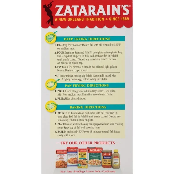 Zatarain’s® Fish Fri Wonderful Seafood Breading’s flaky, corn flour coating brings the rich traditions of Big Easy cooking straight to your family’s table. Roll or shake fish in breading, then toss it in the deep fryer, oven or skillet until golden brown on the outside and flaky in the middle.