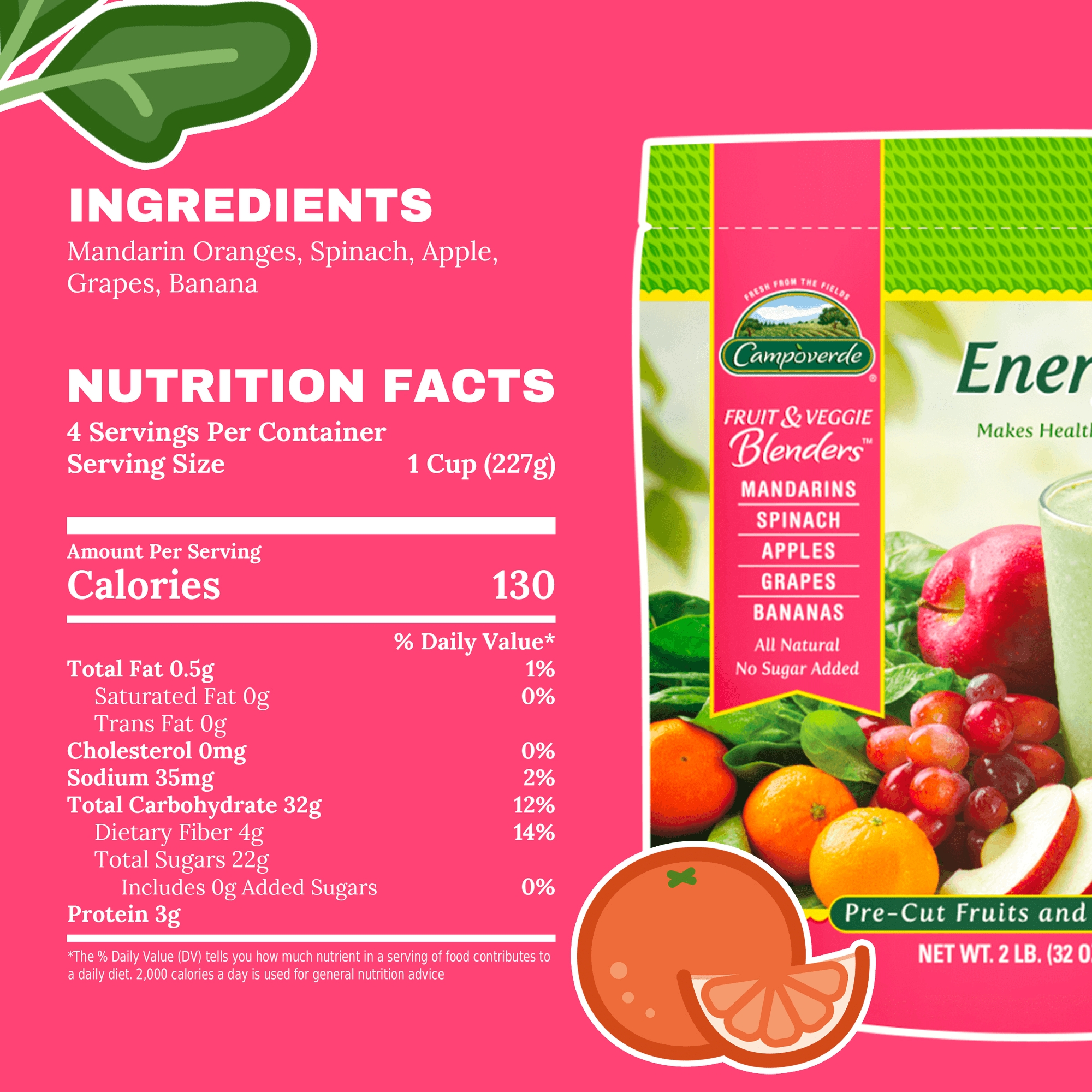Campoverde Frozen Fruit & Veggie Smoothie 4 Packs, Energy Boost, 32oz Bag – Campoverde Frozen Fruit & Veggie Smoothie 4 pre-portioned packs, Energy Boost in a 32oz bag. This delicious combination of spinach, banana, mandarin, apples, and grapes is the perfect option for breakfast or a quick snack. Our fruits and vegetables are collected directly from the fields and are thoroughly cleaned, providing you with the highest quality products. Energy Boost is a tasty combination of Spinach, Banana, Mandarin, Apples, and Grapes. Our all-natural, ready-to-blend, pre-portioned smoothie packs contain grade A fruits & veggies that are individually quick-frozen (IQF) frozen at the peak of ripeness. Each pack contains only fresh fruits and vegetables and no sugar added, no preservatives and no additives of any kind. Campoverde’s Fruit & Veggie Blenders are a great option for a healthy on-the-go breakfast, snack, or dessert. Health and Wellness with the great taste of Campoverde.