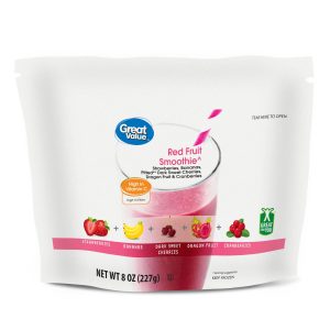 Enjoy the delicious and nutritious taste of a satisfying treat any time of the day. Simply combine the contents with 12 fluid ounces of water into a blender. Blend for 60 seconds or until it reaches the desired consistency. For a delicious treat, you can substitute water with your favorite juice or milk. Bring home the Great Value Red Fruit and Vegetable Smoothie today.